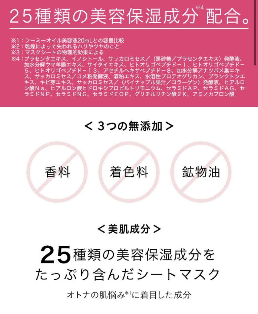 - 美容液約1本分※1をたっぷり含んだ贅沢なシートマスク ※1:フーミーオイル美容液20mLとの容量比較
