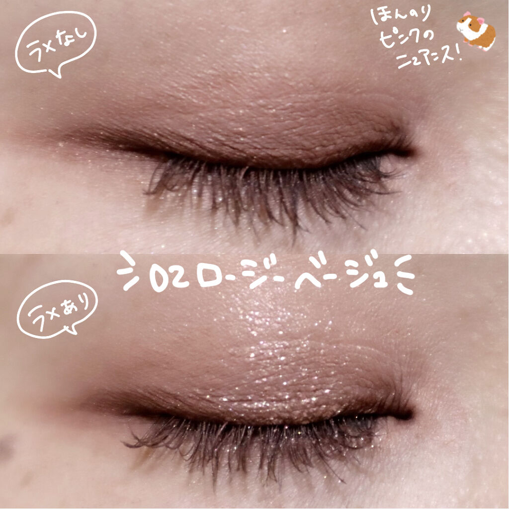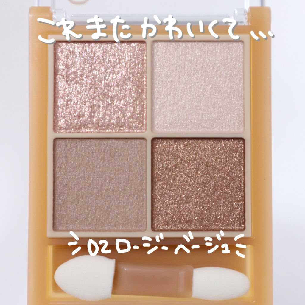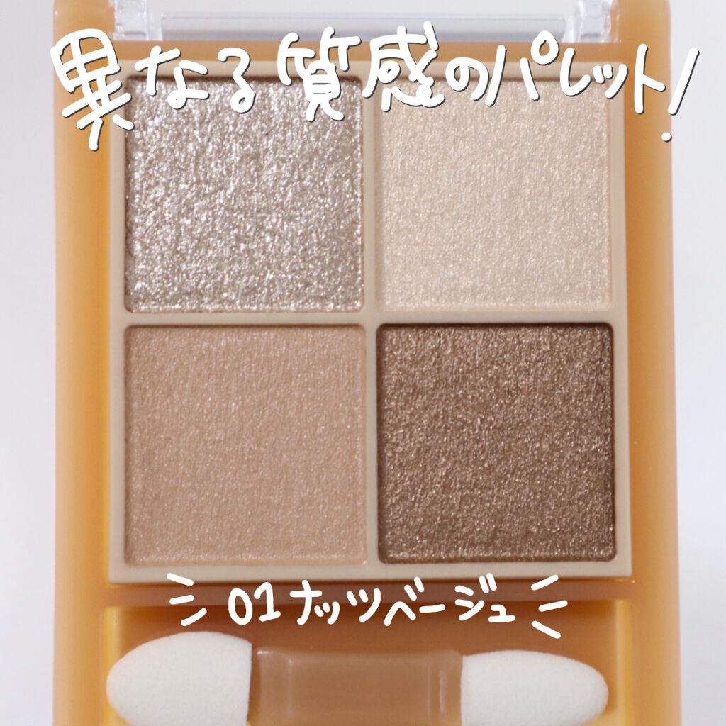- ラメ・パール・マット3質感の4色アイシャドウ。 肌馴染みの良いベージュを基調としたカラー。ラメ・パール・マットの3質感を重ねて、自然にまぶたを強調し奥行のある大きな目元へ。 しっとり溶け込むような柔らかなパウダーなので、スルスル伸びてまぶたにピタッと密着。保湿成分(スクワラン・ホホバ種子油)配合。