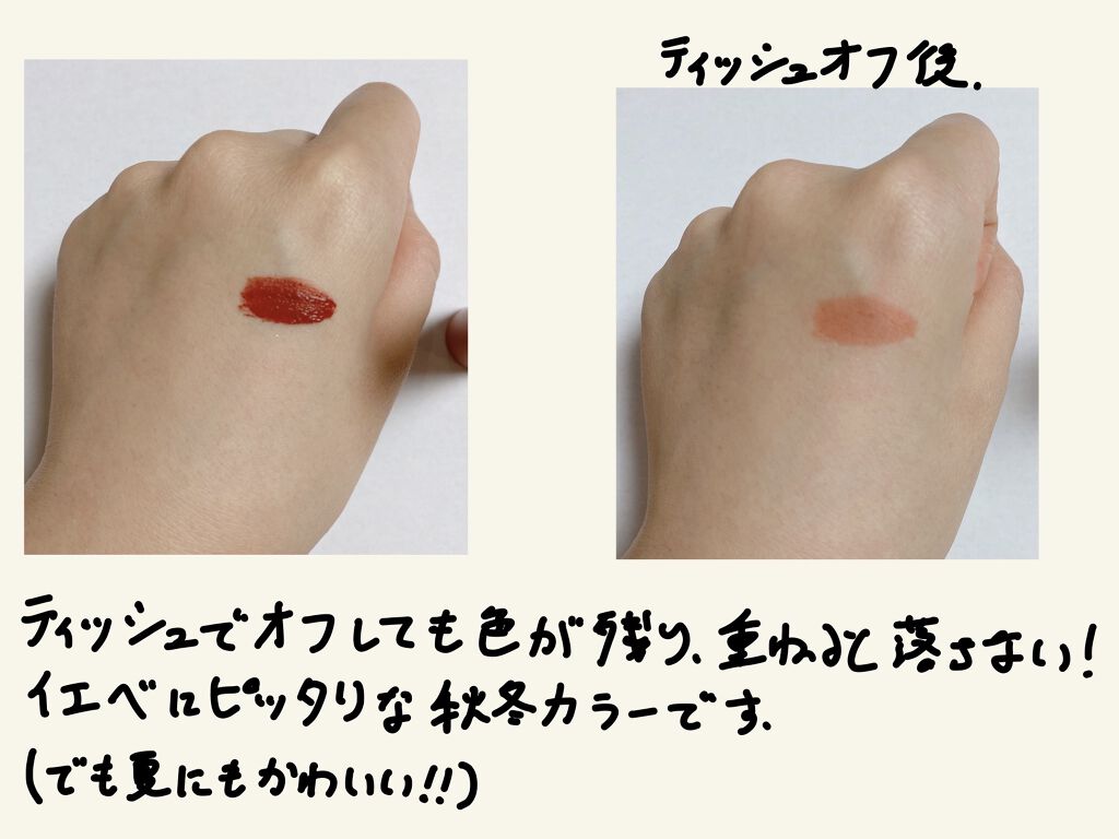 | リップティントランキング第49位 | 唇にピタッと密着しているような感じがあり、なじみが良い 1度塗りだと薄づきでナチュラルな発色になり、塗り重ねていくとしっかり発色して可愛い | 詳細を見る | |