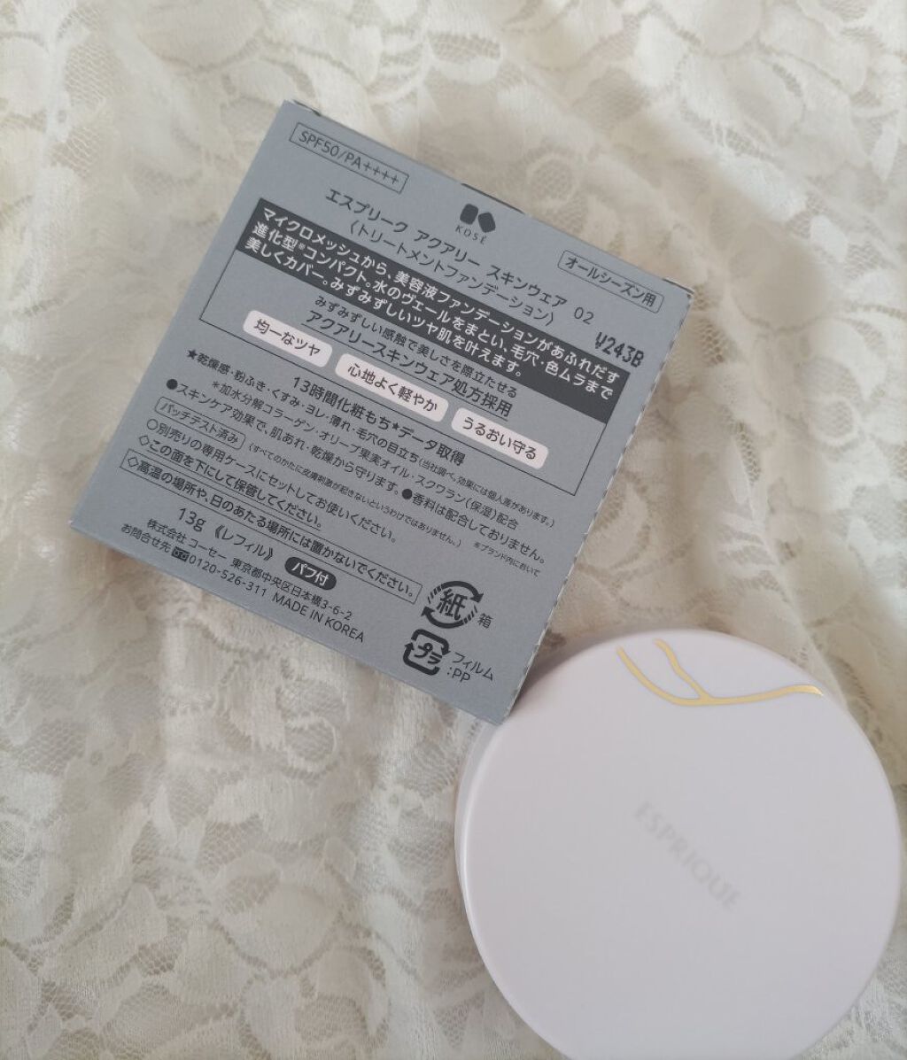 - アクアリースキンウェア処方が叶える、水をまとってカバーする新感覚ベースメイク。 水をまとったような軽やかな化粧膜が、みずみずしいツヤ肌へ。 毛穴・色ムラを美しくカバーする、進化型コンパクト。 ・特殊なマイクロメッシュを通すことで、クリームから美容液ファンデーションへ。裏ごしされてじゅわっと出てくる新感覚 裏ごしファンデ。 ・肌にまとうような、軽く心地よい使用感とツヤを叶えます。 ・軽やかなのに、毛穴・色ムラを美しくカバー。