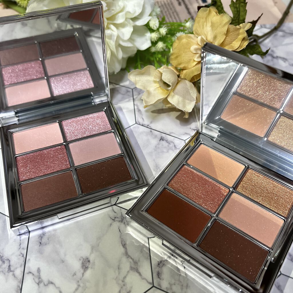 私はイエベ春ですが、同じイエベ系なのでとても肌になじんでしっくり!✨ ホワイト⇒レッドブラウン⇒ゴールド⇒ ダークブラウンの順でコントラストをつけて、 塗る幅をだんだん少なくしてつけています👀 上2色はラメ感あり。 下2色はマットな質感。 バランス良し◎