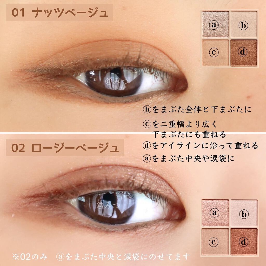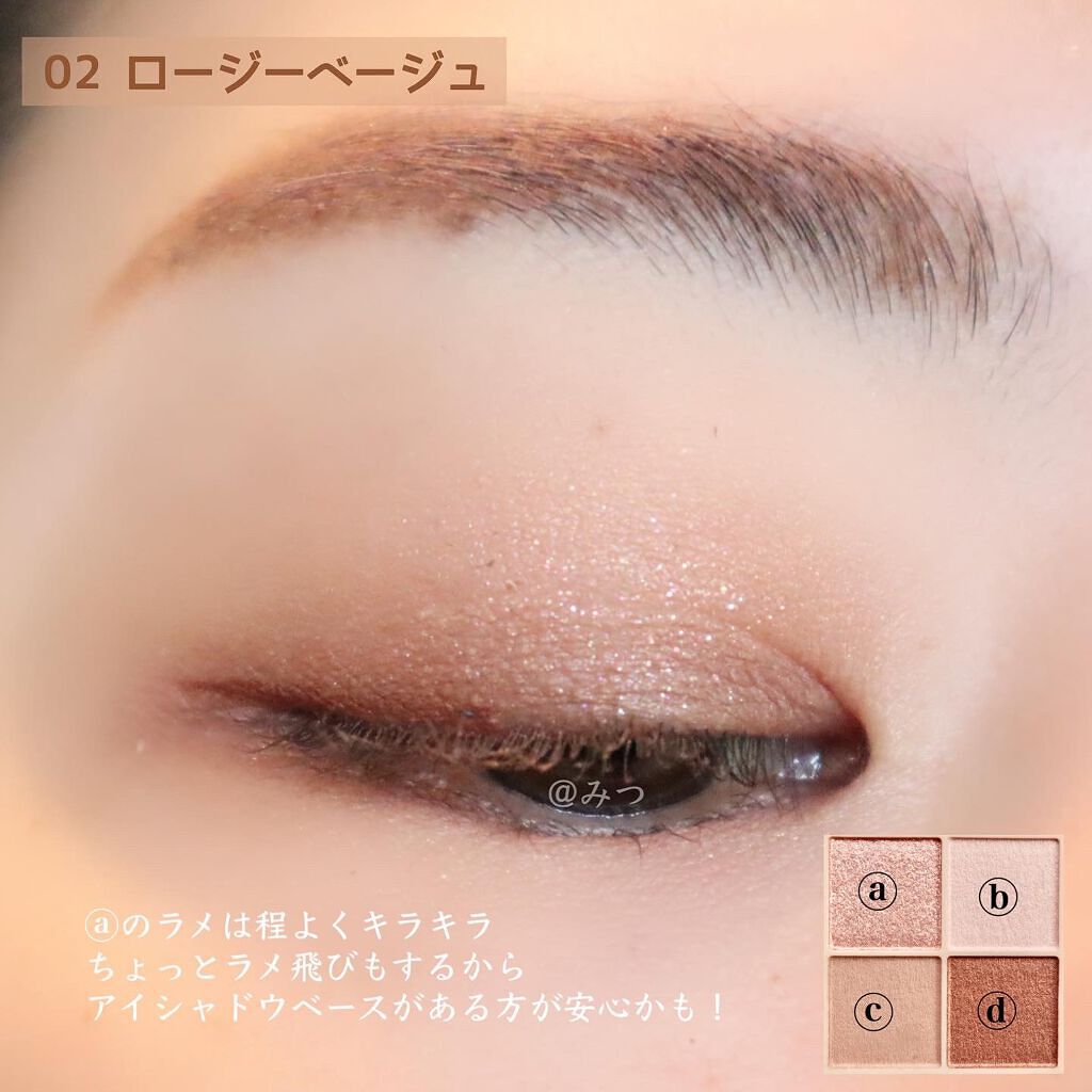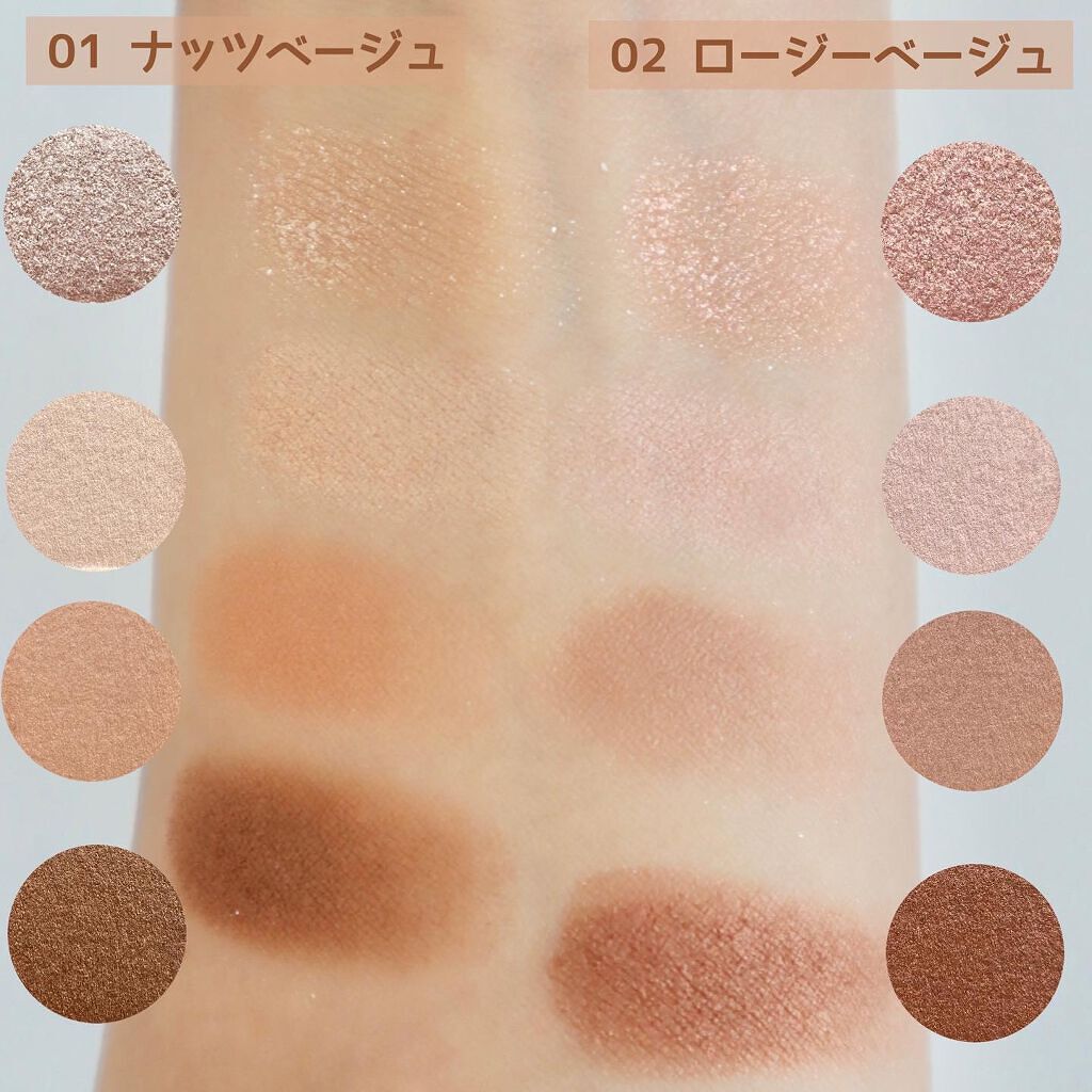 - ラメ・パール・マット3質感の4色アイシャドウ。 肌馴染みの良いベージュを基調としたカラー。ラメ・パール・マットの3質感を重ねて、自然にまぶたを強調し奥行のある大きな目元へ。 しっとり溶け込むような柔らかなパウダーなので、スルスル伸びてまぶたにピタッと密着。保湿成分(スクワラン・ホホバ種子油)配合。