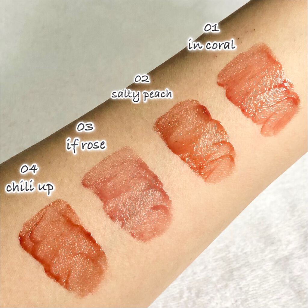 - <01 インコーラル> 水、ビスジグリセリルポリアシルアジペート-2、グリセリン、ジフェニルジメチコン、ジフェニルシロキシフェニルトリメチコン、ポリグリセリン-3、リンゴ酸ジイソステアリル、水添ポリイソブテン、ポリブテン、トリメチルシロキシフェニルジメチコン、変性アルコール、ポリソルベート60、イソノナン酸イソノニル、ペンチレングリコール、(アクリル酸ヒドロキシエチル/アクリロイルジメチルタウリンNa)コポ リマー、ラベンダーエキス、ハナハッカ花/葉/茎エキス、ローズマリーエキス、タイムエキス、ステアリン酸グリセリル、ステアリン酸PEG-100、スクワラン、ラウリルPEG-10トリス(トリメチルシロキシ)シリルエチルジメチコン、エチルヘキシルグリセリン、デキストリン、ステビオシド、イソステアリン酸ソルビタン、エチレンジアミンジコハク酸3Na、水酸化Al、ポリアクリル酸アンモニウム、BG、トコフェロール、フェノキシエタノール、香料、リモネン、酸化チタン、黄5、赤227、黄4、青1 <03 イフローズ> 水、ビスジグリセリルポリアシルアジペート-2、グリセリン、ジフェニルジメチコン、ジフェニルシロキシフェニルトリメチコン、ポリグリセリン-3、リンゴ酸ジイソステアリル、水添ポリイソブテン、ポリブテン、トリメチルシロキシフェニルジメチコン、変性アルコール、ポリソルベート60、イソノナン酸イソノニル、ペンチレングリコール、(アクリル酸ヒドロキシエチル/アクリロイルジメチルタウリンNa)コポリマー、ラベンダーエキス、ハナハッカ花/葉/茎エキス、ローズマリーエキス、タイムエキス、ステアリン酸グリセリル、ステアリン酸PEG-100、スクワラン、ラウリルPEG-10トリス(トリメチルシロキシ)シリルエチルジメチコン、エチルヘキシルグリセリン、デキストリン、ステビオシド、トリイソステアリン酸ポリグリセリル-2、イソステアリン酸ソルビタン、エチレンジアミンジコハク酸3Na、水酸化Al、ポリアクリル酸アンモニウム、BG、トコフェロール、フェノキシエタノール、香料、リモネン、酸化チタン、黄5、赤227、青1、黄4、赤218 <04 チリアップ> 水、ビスジグリセリルポリアシルアジペート-2、グリセリン、ジフェニルジメチコン、ジフェニルシロキシフェニルトリメチコン、ポリグリセリン-3、リンゴ酸ジイソステアリル、水添ポリイソブテン、ポリブテン、トリメチルシロキシフェニルジメチコン、変性アルコール、ポリソルベート60、イソノナン酸イソノニル、ペンチレングリコール、(アクリル酸ヒドロキシエチル/アクリロイルジメチルタウリンNa)コポ リマー、ラベンダーエキス、ハナハッカ花/葉/茎エキス、ローズマリーエキス、タイムエキス、ステアリン酸グリセリル、ステアリン酸PEG-100、スクワラン、ラウリルPEG-10トリス(トリメチルシロキシ)シリルエチルジメチコン、エチルヘキシルグリセリン、デキストリン、ステビオシド、イソステアリン酸ソルビタン、エチレンジアミンジコハク酸3Na、トコフェロール、BG、フェノキシエタノール、料、リモネン、黄5、赤227、黄4、青1 <06 チュリアン> 水、ビスジグリセリルポリアシルアジペート-2、グリセリン、ジフェニルジメチコン、ジフェニルシロキシフェニルトリメチコン、ポリグリセリン-3、リンゴ酸ジイソステアリル、水添ポリイソブテン、ポリブテン、トリメチルシロキシフェニルジメチコン、変性アルコール、ポリソルベート60、イソノナン酸イソノニル、ペンチレングリコール、(アクリル酸ヒドロキシエチル/アクリロイルジメチルタウリンNa)コポリマー、ラベンダーエキス、ハナハッカ花/葉/茎エキス、ローズマリーエキス、タイムエキス、ステアリン酸グリセリル、ステアリン酸PEG-100、スクワラン、ラウリルPEG-10トリス(トリメチルシロキシ)シリルエチルジメチコン、エチルヘキシルグリセリン、デキストリン、ステビオシド、イソステアリン酸ソルビタン、エチレンジアミンジコハク酸3Na、水酸化Al、ポリアクリル酸アンモニウム、BG、トコフェロール、フェノキシエタノール、香料、リモネン、酸化チタン、黄5、赤227、酸化鉄、黄4、赤218、青1 <08 ベリーディヴァイン> 水、ビスジグリセリルポリアシルアジペート-2、グリセリン、ジフェニルジメチコン、ジフェニルシロキシフェニルトリメチコン、ポリグリセリン-3、リンゴ酸ジイソステアリル、水添ポリイソブテン、ポリブテン、トリメチルシロキシフェニルジメチコン、変性アルコール、ポリソルベート60、イソノナン酸イソノニル、ペンチレングリコール、(アクリル酸ヒドロキシエチル/アクリロイルジメチルタウリンNa)コポリマー、ラベンダーエキス、ハナハッカ花/葉/茎エキス、ローズマリーエキス、タイムエキス、ステアリン酸グリセリル、ステアリン酸PEG-100、スクワラン、ラウリルPEG-10トリス(トリメチルシロキシ)シリルエチルジメチコン、エチルヘキシルグリセリン、イソステアリン酸ソルビタン、デキストリン、ステビオシド、エチレンジアミン