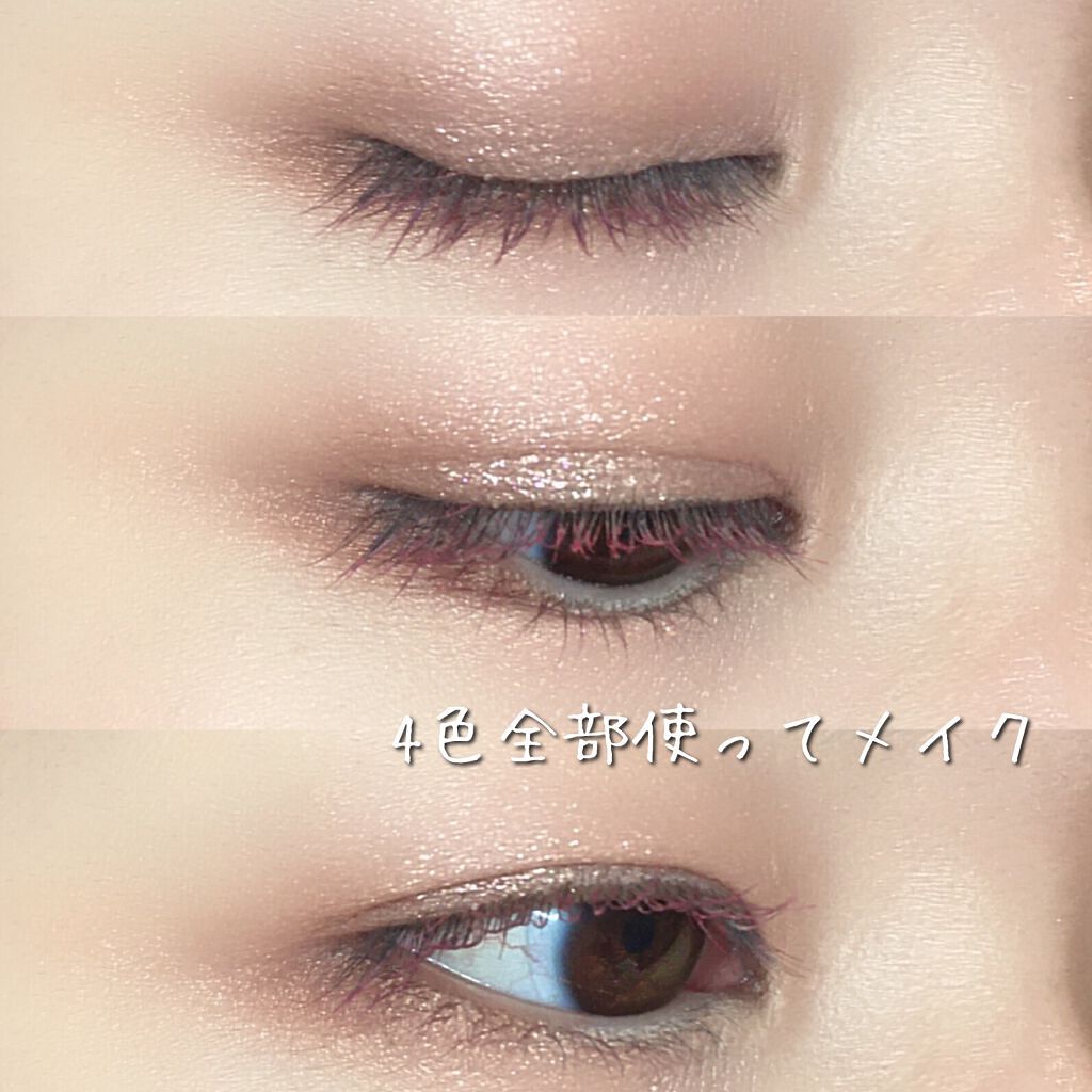 - ラメ・パール・マット3質感の4色アイシャドウ。 肌馴染みの良いベージュを基調としたカラー。ラメ・パール・マットの3質感を重ねて、自然にまぶたを強調し奥行のある大きな目元へ。 しっとり溶け込むような柔らかなパウダーなので、スルスル伸びてまぶたにピタッと密着。保湿成分(スクワラン・ホホバ種子油)配合。