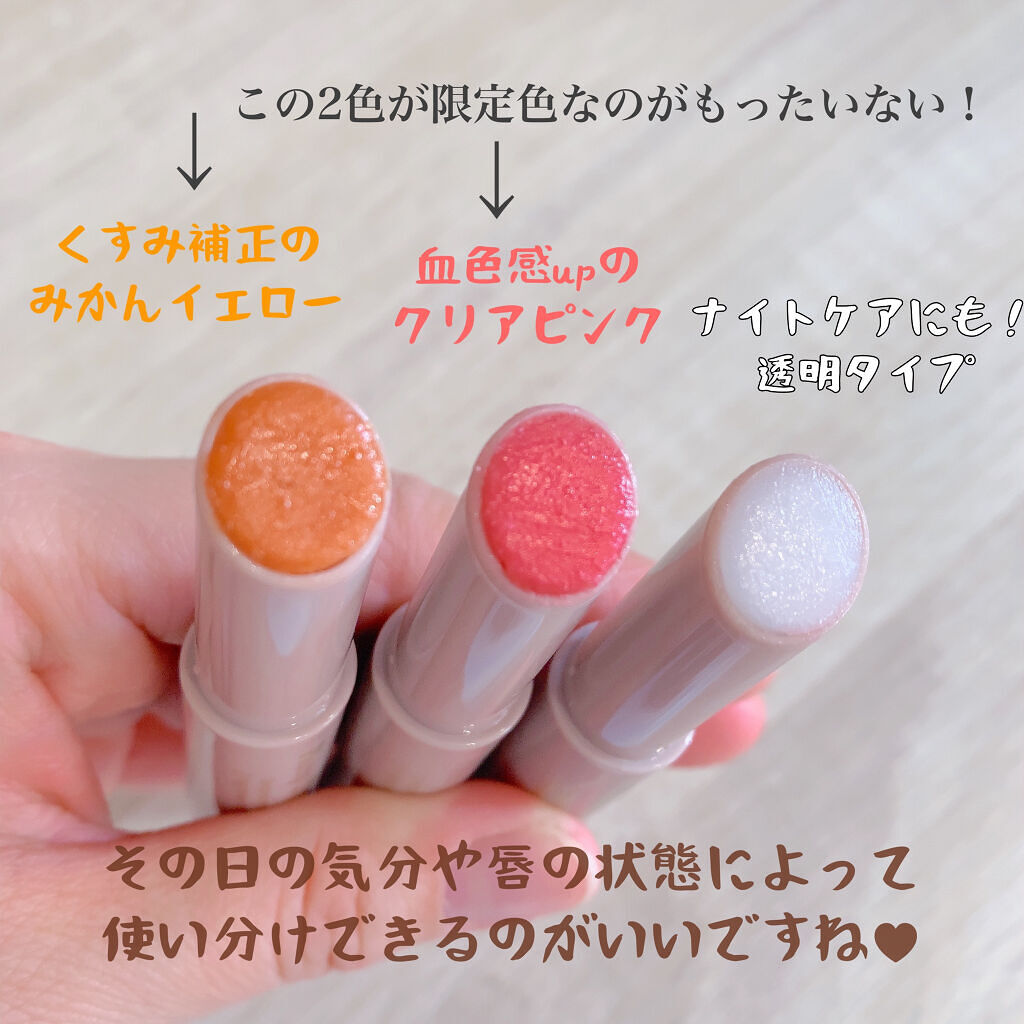 - <01 クリア> 水添ポリイソブテン、ワセリン、オリーブ果実油、ジエチルヘキサン酸ネオペンチルグリコール、スクロース、ポリエチレン、リンゴ酸ジイソステアリル、ジフェニルシロキシフェニルトリメチコン、ジメチルシリル化シリカ、キャンデリラロウ炭化水素、水添ヒマシ油、セスキイソステアリン酸ソルビタン、メントキシプロパンジオール、BG、水、ソメイヨシノ葉エキス、カミツレ花エキス <02 クリアピンク> 水添ポリイソブテン、ワセリン、オリーブ果実油、ジエチルヘキサン酸ネオペンチルグリコール、スクロース、ポリエチレン、リンゴ酸ジイソステアリル、ジフェニルシロキシフェニルトリメチコン、ジメチルシリル化シリカ、キャンデリラロウ炭化水素、水添ヒマシ油、セスキイソステアリン酸ソルビタン、メントキシプロパンジオール、トコフェロール、水酸化Al、BG、水、ソメイヨシノ葉エキス、カミツレ花エキス、酸化チタン、黄4、赤202、酸化鉄 <03 みかんイエロー> 水添ポリイソブテン、ワセリン、オリーブ果実油、ジエチルヘキサン酸ネオペンチルグリコール、スクロース、ポリエチレン、リンゴ酸ジイソステアリル、ジフェニルシロキシフェニルトリメチコン、ジメチルシリル化シリカ、キャンデリラロウ炭化水素、水添ヒマシ油、セスキイソステアリン酸ソルビタン、メントキシプロパンジオール、トコフェロール、BG、水、ソメイヨシノ葉エキス、カミツレ花エキス、黄4、赤202、酸化鉄