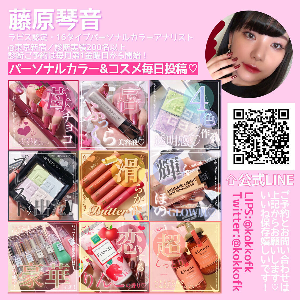 薄く唇に密着する新作マットティント。 マットなのにかなりしっとりとしていて 乾燥を感じなくてびっくりでした! 一気にこなれ感が出るトレンドカラーです♡ やや青みの華やかローズレッド 公式画像より鮮やかめに感じました。 やや黄みの強くて深いオレンジレッド ストロングオータムに超激推しです! やや黄みの非常に深く濃いダークブラウン ディープオータムに激推しです! かわいい雰囲気になれるピンクリップです♡ やや青みの柔らかいくすみピンクベージュ ミューテッドサマーにおすすめです! 青みの落ち着いたローズピンク やや青みのとても鮮やかなビビッドレッド ビビッドウィンターに特におすすめ! 既存マットティントよりもさらに ふわふわなマット感が魅力のリップで、 軽くティッシュオフしてもほとんど落ちない◎ マスクにも激推しのティントなので、 ぜひ皆さんもチェックしてみてね❤︎