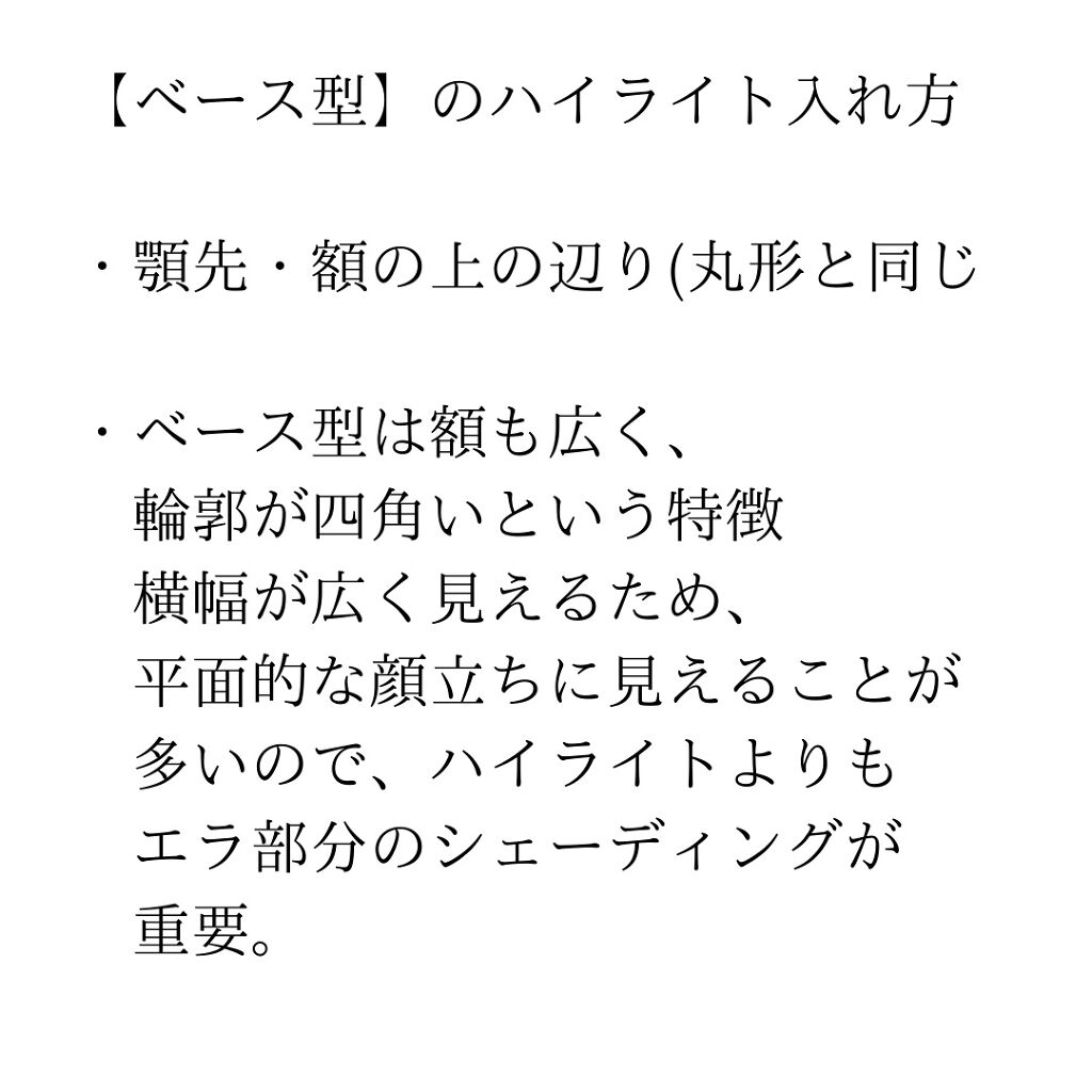 丸顔・横幅を強調しないように塗る・顎に向かってシャープにするように・ハイライトとチークは斜めに 面長・縦幅を強調しないように塗る・おでこと顎を削る・ハイライトは横長に ベース型・顔の重心を目の周りに持っていく・こめかみとエラを削る・チークは頬の中央から 逆三角形・理想的な卵型に近い骨格・ふくらみを持たせるような入れ方・チークは丸く