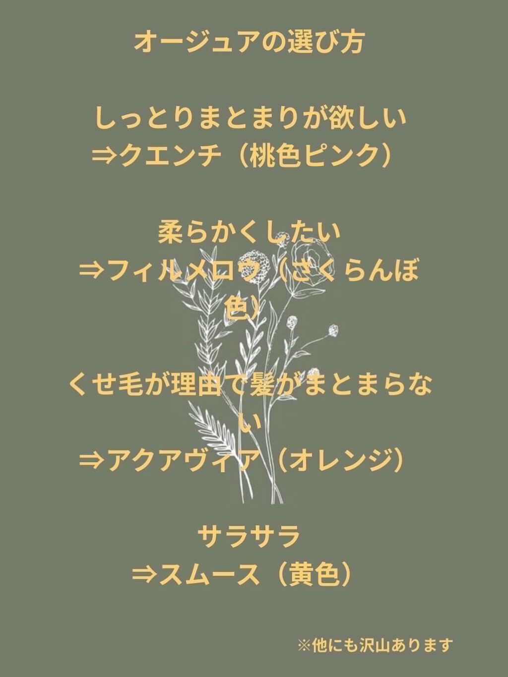 さらっとしたオイル ・熱から守る ・保湿し健康的な髪へ 🍐香りはフルーティーフローラル🪻 こちらはとっても好きな香り!! 常に意識 とにかくいかなる時も摩擦を与えない 髪をとく際にはリファのようなブラシで毛先から