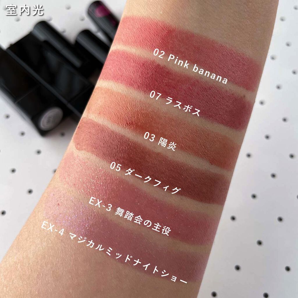 - <01 欲望の塊> テトライソステアリン酸ジペンタエリスリチル、トリ(カプリル酸/カプリン酸)グリセリル、オクチルドデカノール、ラウロイルグルタミン酸ジ(フィトステリル/オクチルドデシル)、ビスアルキル(C16-18)グリセリルウンデシルジメチコン、イソノナン酸イソトリデシル、水添ポリイソブテン、ラウロイルグルタミン酸ジ(オクチルドデシル/フィトステリル/ベヘニル)、パラフィン、合成ワックス、ダイマージリノール酸(フィトステリル/イソステアリル/セチル/ステアリル/ベヘニル)、マイクロクリスタリンワックス、水添マイクロクリスタリンワックス、ヒドロキシステアリン酸エチルヘキシル、トコフェロール、ホホバ種子油、オリーブ果実油、アーモンド油、(エチレン/プロピレン)コポリマー、ポリエチレン、ジメチコン、(+/-)(チタン/酸化チタン)焼結物、マイカ、ラウロイルアスパラギン酸Na、ラウロイルリシン、塩化亜鉛、酸化チタン、酸化鉄、水酸化Al、硫酸Ba、トリイソステアリン酸イソプロピルチタン、酸化スズ、ホウケイ酸(Ca/Al)、合成フルオロフロゴパイト、黄4、黄5、赤104(1)、赤201、赤202 <02 ピンクバナナ> テトライソステアリン酸ジペンタエリスリチル、トリ(カプリル酸/カプリン酸)グリセリル、オクチルドデカノール、ラウロイルグルタミン酸ジ(フィトステリル/オクチルドデシル)、ビスアルキル(C16-18)グリセリルウンデシルジメチコン、イソノナン酸イソトリデシル、水添ポリイソブテン、ラウロイルグルタミン酸ジ(オクチルドデシル/フィトステリル/ベヘニル)、パラフィン、合成ワックス、ダイマージリノール酸(フィトステリル/イソステアリル/セチル/ステアリル/ベヘニル)、マイクロクリスタリンワックス、水添マイクロクリスタリンワックス、ヒドロキシステアリン酸エチルヘキシル、トコフェロール、ホホバ種子油、オリーブ果実油、アーモンド油、(エチレン/プロピレン)コポリマー、ポリエチレン、ジメチコン、(+/-)(チタン/酸化チタン)焼結物、マイカ、ラウロイルアスパラギン酸Na、ラウロイルリシン、塩化亜鉛、酸化チタン、酸化鉄、水酸化Al、硫酸Ba、トリイソステアリン酸イソプロピルチタン、酸化スズ、ホウケイ酸(Ca/Al)、合成フルオロフロゴパイト、黄4、黄5、赤104(1)、赤201、赤202 <03 陽炎> テトライソステアリン酸ジペンタエリスリチル、トリ(カプリル酸/カプリン酸)グリセリル、オクチルドデカノール、ラウロイルグルタミン酸ジ(フィトステリル/オクチルドデシル)、ビスアルキル(C16-18)グリセリルウンデシルジメチコン、イソノナン酸イソトリデシル、水添ポリイソブテン、ラウロイルグルタミン酸ジ(オクチルドデシル/フィトステリル/ベヘニル)、パラフィン、合成ワックス、ダイマージリノール酸(フィトステリル/イソステアリル/セチル/ステアリル/ベヘニル)、マイクロクリスタリンワックス、水添マイクロクリスタリンワックス、ヒドロキシステアリン酸エチルヘキシル、トコフェロール、ホホバ種子油、オリーブ果実油、アーモンド油、(エチレン/プロピレン)コポリマー、ポリエチレン、ジメチコン、(+/-)(チタン/酸化チタン)焼結物、マイカ、ラウロイルアスパラギン酸Na、ラウロイルリシン、塩化亜鉛、酸化チタン、酸化鉄、水酸化Al、硫酸Ba、トリイソステアリン酸イソプロピルチタン、酸化スズ、ホウケイ酸(Ca/Al)、合成フルオロフロゴパイト、黄4、黄5、赤104(1)、赤201、赤202 <04 パンプキンワイン> テトライソステアリン酸ジペンタエリスリチル、トリ(カプリル酸/カプリン酸)グリセリル、オクチルドデカノール、ラウロイルグルタミン酸ジ(フィトステリル/オクチルドデシル)、ビスアルキル(C16-18)グリセリルウンデシルジメチコン、イソノナン酸イソトリデシル、水添ポリイソブテン、ラウロイルグルタミン酸ジ(オクチルドデシル/フィトステリル/ベヘニル)、パラフィン、合成ワックス、ダイマージリノール酸(フィトステリル/イソステアリル/セチル/ステアリル/ベヘニル)、マイクロクリスタリンワックス、水添マイクロクリスタリンワックス、ヒドロキシステアリン酸エチルヘキシル、トコフェロール、ホホバ種子油、オリーブ果実油、アーモンド油、(エチレン/プロピレン)コポリマー、ポリエチレン、ジメチコン、(+/-)(チタン/酸化チタン)焼結物、マイカ、ラウロイルアスパラギン酸Na、ラウロイルリシン、塩化亜鉛、酸化チタン、酸化鉄、水酸化Al、硫酸Ba、トリイソステアリン酸イソプロピルチタン、酸化スズ、ホウケイ酸(Ca/Al)、合成フルオロフロゴパイト、黄4、黄5、赤104(1)、赤201、赤202 <05 ダークフィグ> テトライソステアリン酸ジペンタエリスリチル、トリ(カプリル酸/カプリン酸)グリセリル、オクチルドデカノール、ラウロイルグルタミン酸ジ(フィトステリル/オクチルドデシル)、ビスアルキル(C16-18)グリセリルウンデシルジメチコン、イソノナン酸イソトリデシル、水添ポリイソブテン、ラウロイルグルタミン酸ジ(オクチルドデシル/フィトステリル/ベヘニル)、
