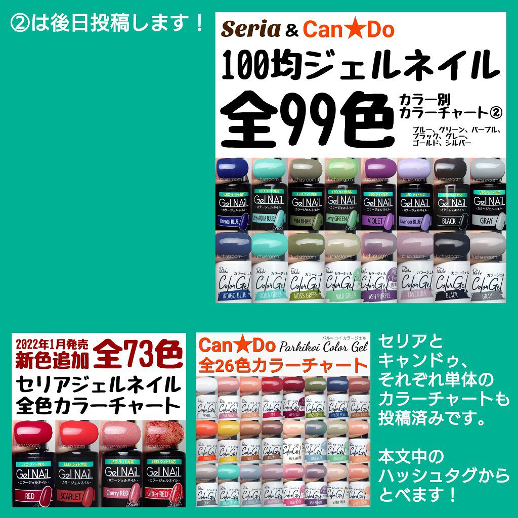 完全版!!セリアの全色カラーチャート💅🏻セリアのジェルネイルについては公式ホームページや公式Instagramがないため、今までは「抜けている色があるかも」「廃番色が含まれているかも」な「全色(?)カラーチャート」でした💦しかしこの度セリア様...