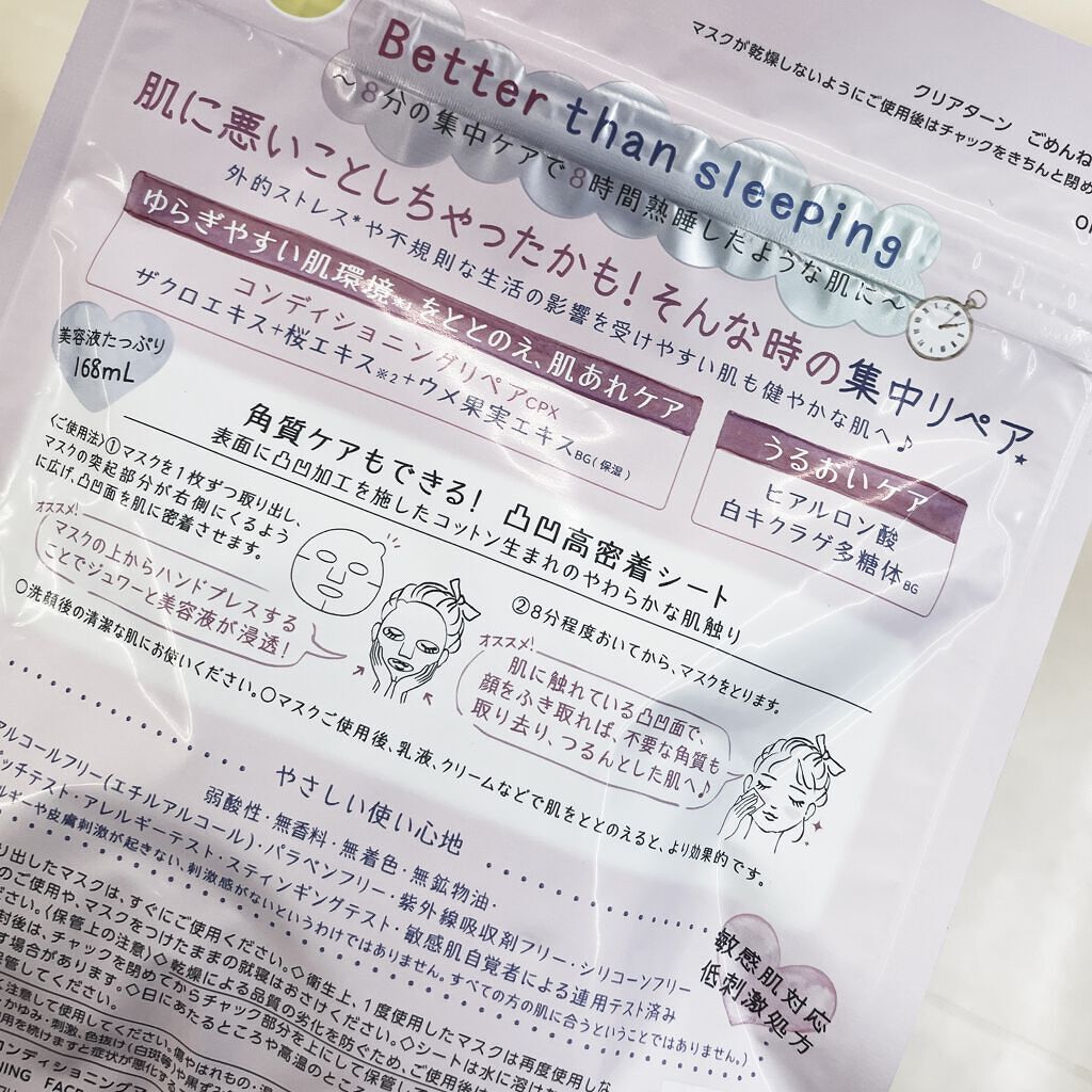 - 【クリアターン ごめんね素肌マスク】 負担をかけて、あれてしまった肌の素肌環境※1をととのえる“速攻集中リペア※2マスク”です。 ① あれがちな肌を素早くコンディションケア! ザクロエキス、桜エキス※3、ウメ果実エキスBG配合し、ゆらぎやすい肌環境をととのえ、肌あれをケアします。また、うるおいケア成分として、ヒアルロン酸、白キクラゲ多糖体BGを配合。外的ストレス※4や不規則な生活の影響を受けやすい肌も健やかでゆらぎにくい肌へみちびきます。 ②敏感肌も使える、弱酸性・低刺激処方 無香料・無着色・無鉱物油・アルコールフリー(エチルアルコール)・パラベンフリー・紫外線吸収剤フリー・シリコーンフリー・パッチテスト済み・アレルギーテスト済み・スティンギングテスト済み・敏感肌自覚者による連用テスト済み(すべての方にアレルギーや皮膚刺激が起きない、刺激感がないというわけではありません。すべての方の肌に合うということではありません。) ③角質ケアもできる!凸凹高密着シート コットン生まれのやわらかな肌触りのベンリーゼを使用。 表面に凸凹のエンボス加工を施しているため、密着性が高く、はがしたマスクでやさしく顔をふきとることで角質ケアもできます。 ※1 うるおい環境のこと ※2 うるおいお手入れのこと ※3 ソメイヨシノ葉エキス、ウメ果実エキスBGはウメ果実エキス・BG(保湿) ※4 乾燥による刺激のこと