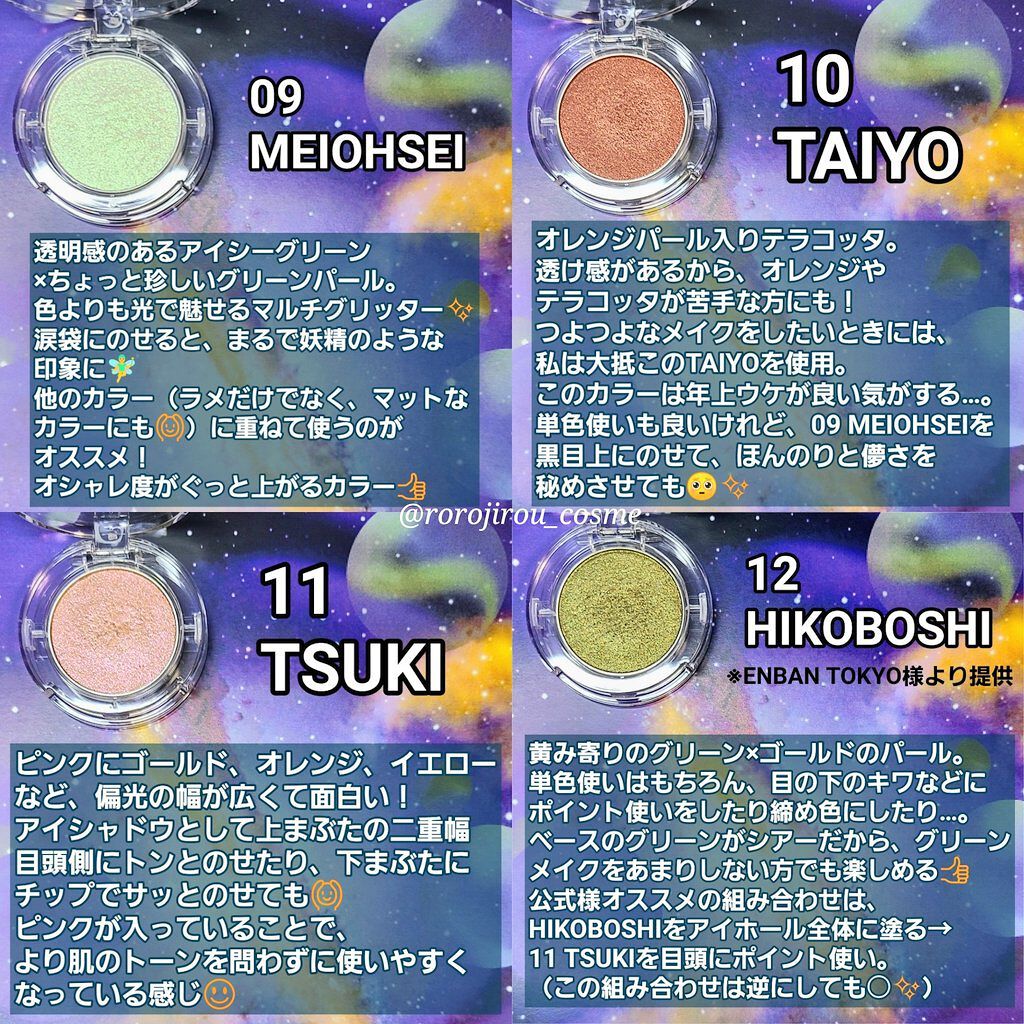 偏光ラメ、青ラメ、ピンクラメ、紫ラメが最高にかわいくて好きだった 固めテクスチャでちょっと使いにくかったけどまぶたにはもちろん、リップやチークにラメを重ねるとはかなげな輝きが楽しめる ENBAN TOKYOに出会った頃はブルベ冬カラーにこだわってて、グリーン系は後回しにしてたんだよね… ENBAN TOKYO様 星とラメの素敵なマルチグリッター ありがとうございましたこれからも大切に使います