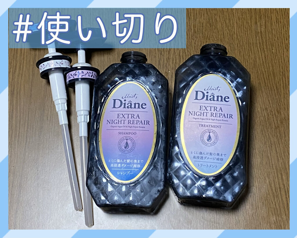 ダイアンパーフェクトビューティー エクストラナイトリペア シャンプー トリートメント 450mlセットで1,000円くらいで購入!!シャンプーは緩め。すすぐとき指通らんくらいつるっつるのキッシキシ😳トリートメントするとマシになるけど...ド...
