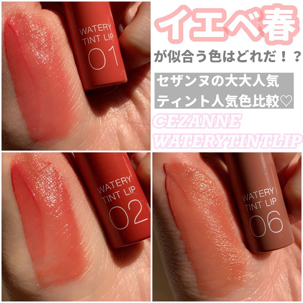 - ツヤ×色×潤いをキープする、セザンヌの新濡れツヤリップ みずみずしい濡れツヤ感ある仕上がりで、発色とツヤが長続きするティントリップです。ティントの発色を透明のベールで覆うリップコートのような処方で、ツヤ感と色をキープします。さらに、唇表面のべたつきは少なく、しっとり潤うオイルinウォーター処方を採用しています。