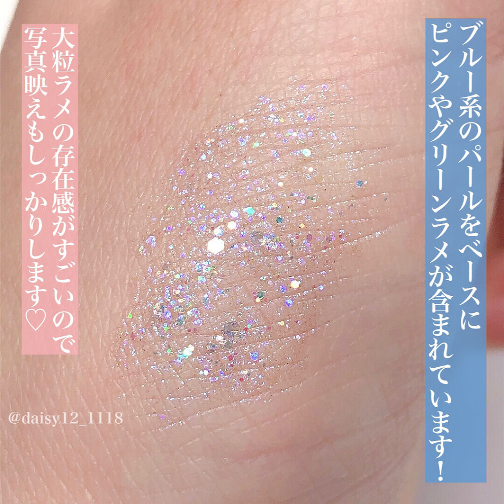 ブルーをメインに、ピンク•グリーンのラメ入り💖 淡いブルーで儚げな印象に🫰🏻大粒ホロ入りでしっかりラメをつけている感じが出る! 存在感抜群❣️ 青ラメたっぷりなので、ブルベの方におすすめのグリッターです🩵 涙袋やラメを目立たせたい時にピッタリのグリッター☺︎ ぜひチェックしてみてね💫
