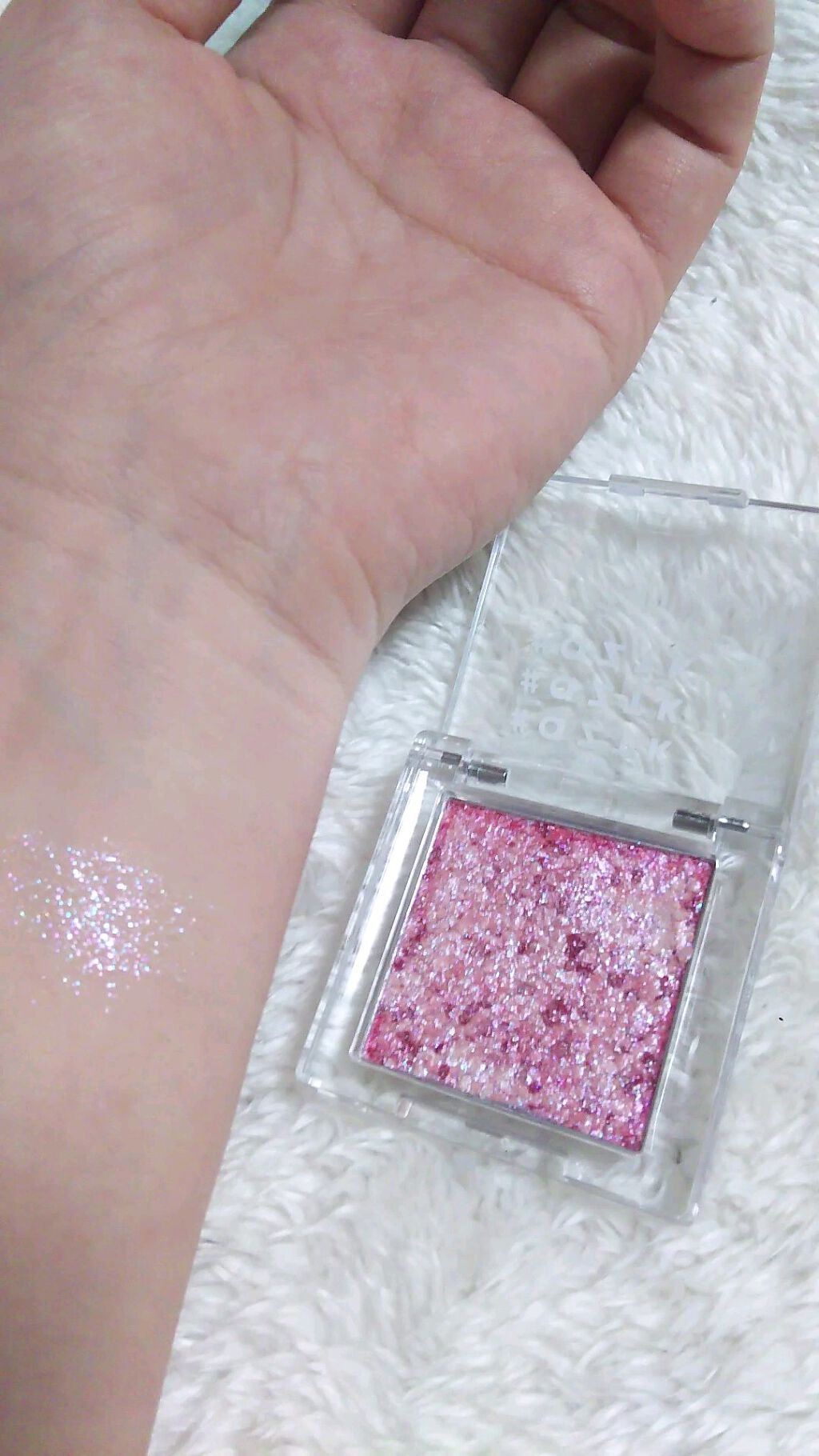 色々なカラーバリエーションがありますが、スタンダードなパレットです。 使いやすい色のセットで、そこまでえげつなく発色するわけではなく、かといって発色しないわけでもないパレットです。 マットの粉はみっしりと詰まっていて、わりとしっかりとした筆じゃないと案外粉が取れないかもしれません。 チップ等が付属していないのはちゃんとした筆を用意してほしいということなのかも……? それはこのキラキラの多色ラメ、粉が緻密で軽すぎて、飛ぶこと…… アイベースを使っていても飛ぶので、結構致命的です。 それでも色はいいし粉もこの値段なら悪くないのでプチプラの中ではおすすめ出来る方です。