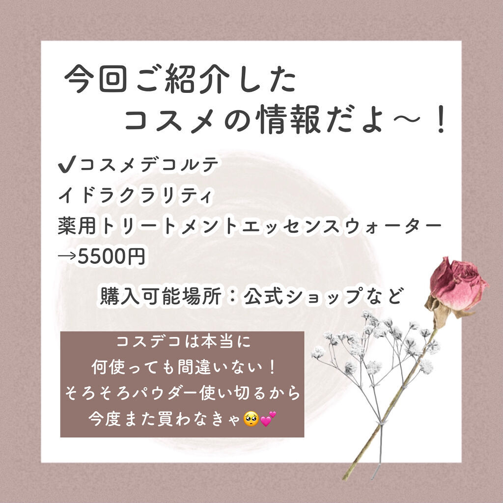 💡使い切りレビュー❣️肌荒れに良い。透明感が出る✨【使った商品】イドラクラリティ薬用トリートメントエッセンスウォーター/本体【商品の特徴】みずみずしく、透き通る。「美肌糖」の透明感。すみずみまで浸透。肌あれ・ニキビを防ぎ、ふっくら弾む肌に導く...