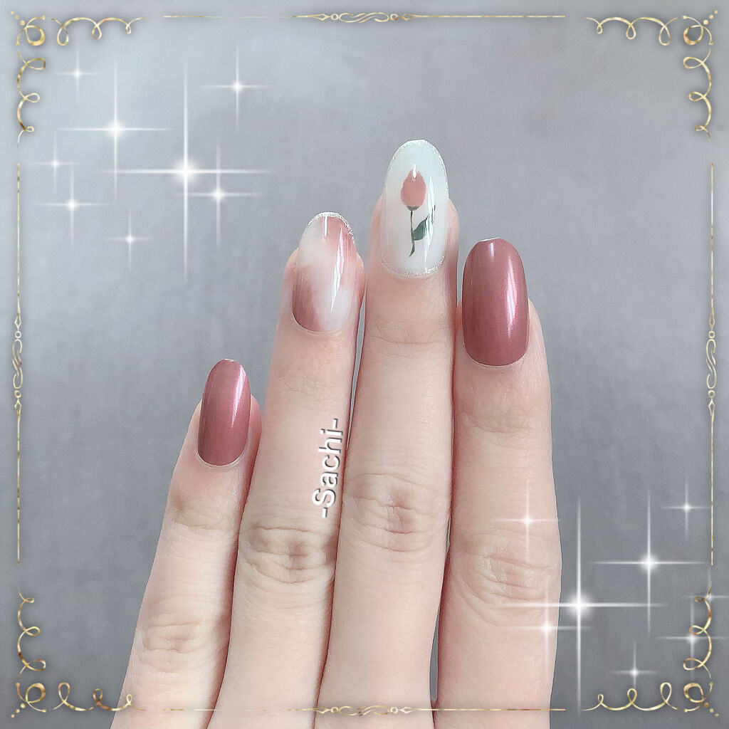 可愛いチューリップとニュアンス合わせが オシャレ〜🤤💕 そしてALICEちゃんの網戸ネイルのやつから 1本引っこ抜いてきたやつだっ! ってすぐ分かったわよ😁🌷