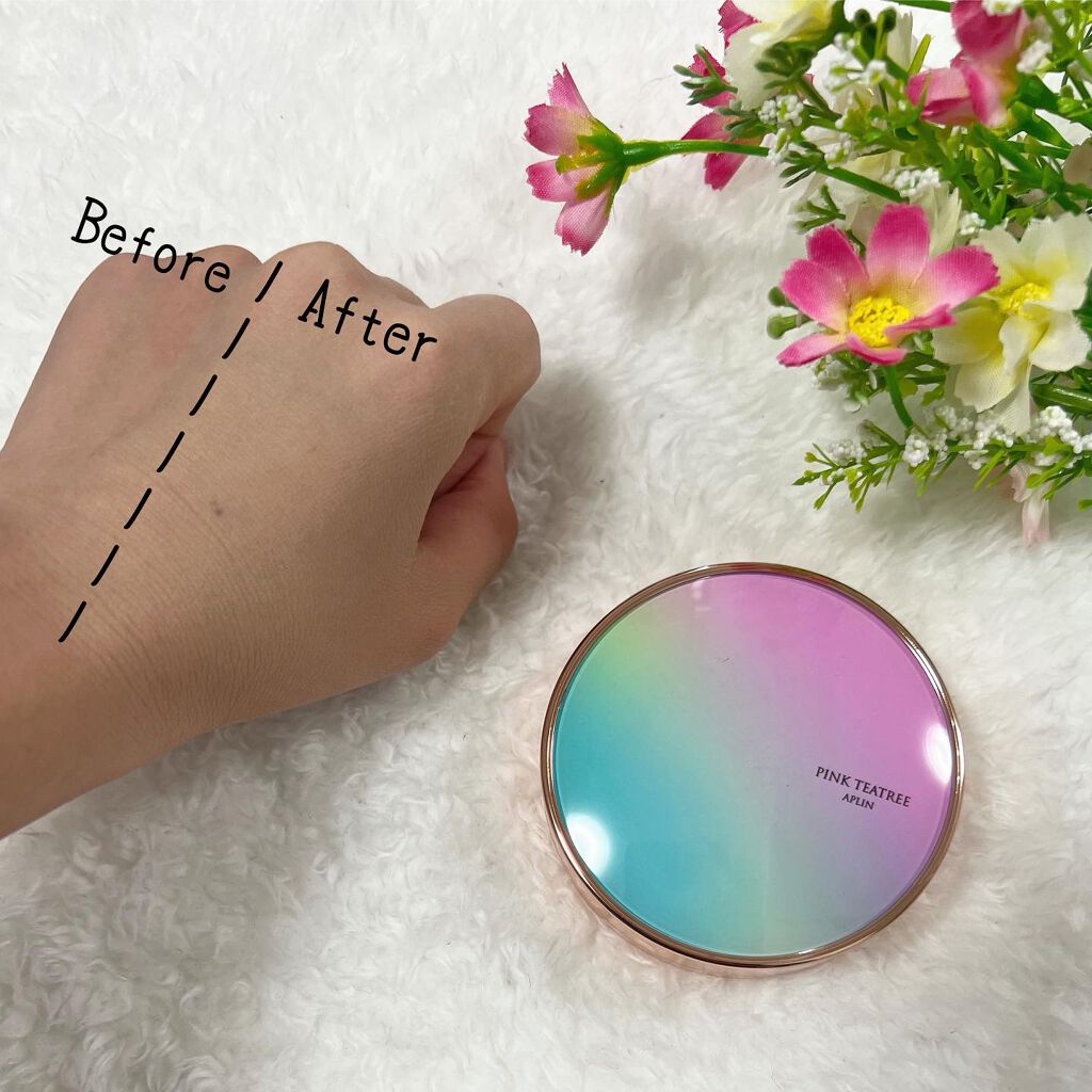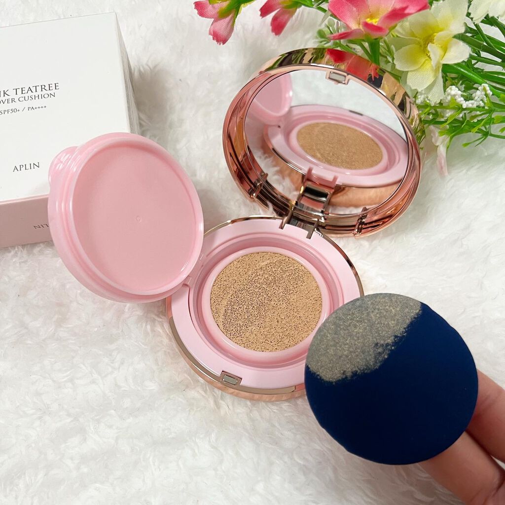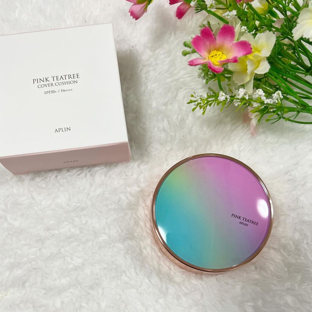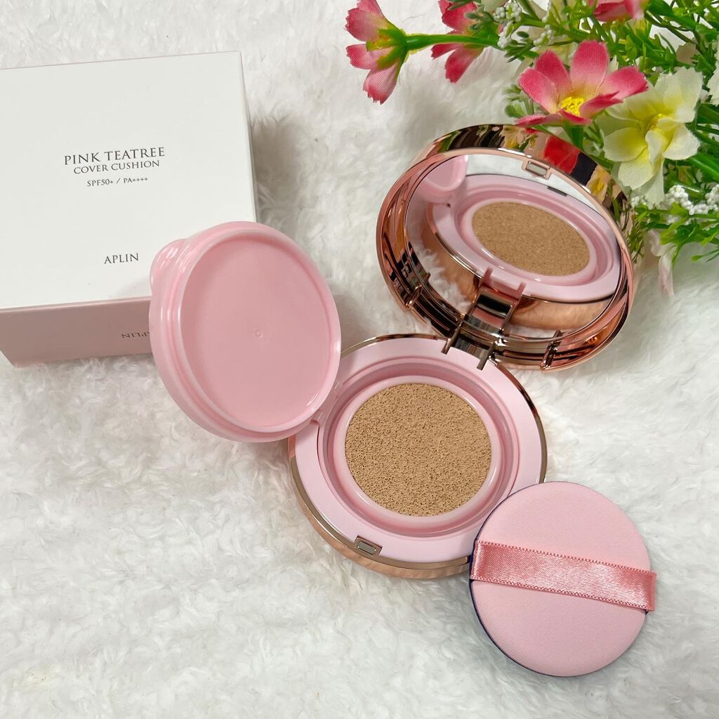 APLIN ピンクティーツリーカバークッション 21号ライトベージュ 2,490円(税込) 少量でよく伸びてハイカバー! 赤みやくすみをしっかりカバ一できるのに、厚塗り感のないなめらかな仕上がり♡ ハイカバーなのにナチュラルなツヤ感とサラッとしつつ、乾燥崩れしにくい仕上がりに感動します!!
