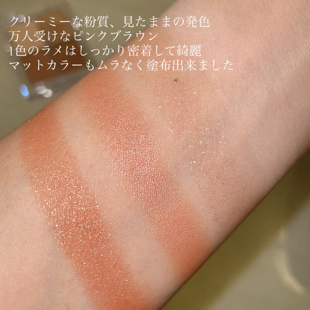 全体的に淡めです! イエベ向きな黄色みのあるブラウン系🤎 シマーなラメが可愛すぎる!! 密着度の高いラメでポンと乗せるだけで キラッキラ✨✨ 粉飛びもしないです! 発色はいいですが淡いので 初心者さんでも使いやすい!!!