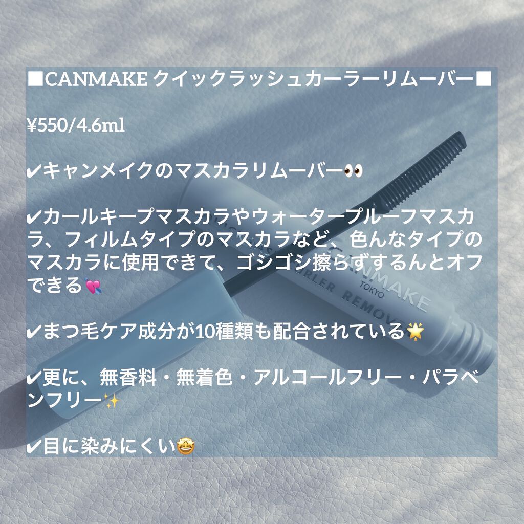 キャンメイクのクイックラッシュカーラーを落とす用のリムーバーです👀 コーム型のマスカラのような構造で、まつ毛に塗るとこすらずするんとオフできます! マスカラリムーバーに多い目に染みることも今のところありません! クイックラッシュカーラーはもちろん、他のウォータープルーフのマスカラにも使用できます👍 ウォータープルーフのマスカラを日常的に使っている方はぜひ試してみてください!!