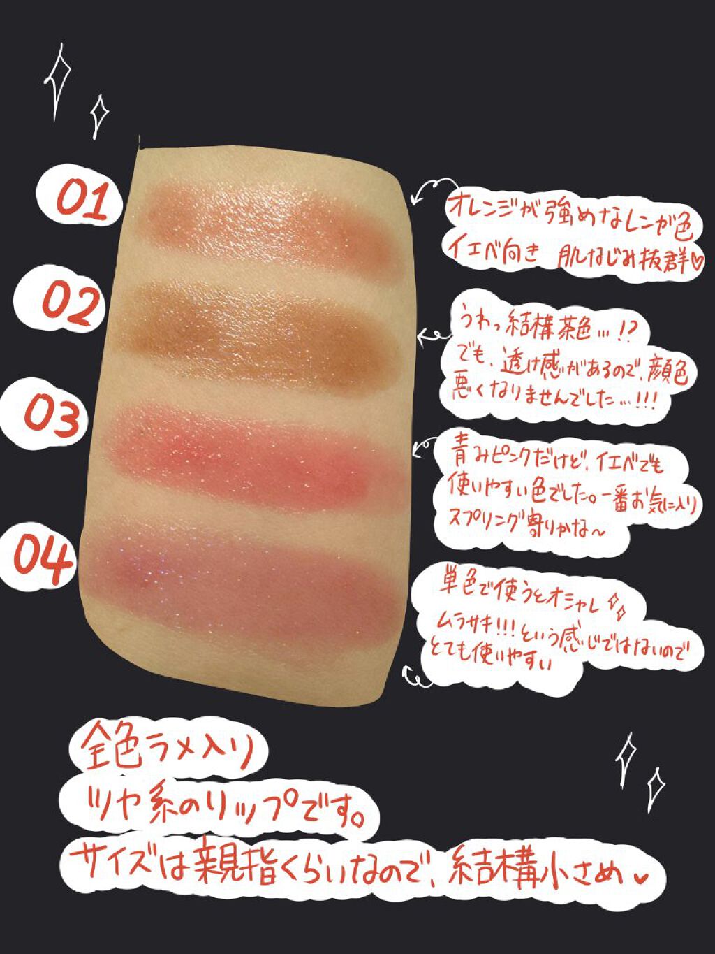 - <01 欲望の塊> テトライソステアリン酸ジペンタエリスリチル、トリ(カプリル酸/カプリン酸)グリセリル、オクチルドデカノール、ラウロイルグルタミン酸ジ(フィトステリル/オクチルドデシル)、ビスアルキル(C16-18)グリセリルウンデシルジメチコン、イソノナン酸イソトリデシル、水添ポリイソブテン、ラウロイルグルタミン酸ジ(オクチルドデシル/フィトステリル/ベヘニル)、パラフィン、合成ワックス、ダイマージリノール酸(フィトステリル/イソステアリル/セチル/ステアリル/ベヘニル)、マイクロクリスタリンワックス、水添マイクロクリスタリンワックス、ヒドロキシステアリン酸エチルヘキシル、トコフェロール、ホホバ種子油、オリーブ果実油、アーモンド油、(エチレン/プロピレン)コポリマー、ポリエチレン、ジメチコン、(+/-)(チタン/酸化チタン)焼結物、マイカ、ラウロイルアスパラギン酸Na、ラウロイルリシン、塩化亜鉛、酸化チタン、酸化鉄、水酸化Al、硫酸Ba、トリイソステアリン酸イソプロピルチタン、酸化スズ、ホウケイ酸(Ca/Al)、合成フルオロフロゴパイト、黄4、黄5、赤104(1)、赤201、赤202 <02 ピンクバナナ> テトライソステアリン酸ジペンタエリスリチル、トリ(カプリル酸/カプリン酸)グリセリル、オクチルドデカノール、ラウロイルグルタミン酸ジ(フィトステリル/オクチルドデシル)、ビスアルキル(C16-18)グリセリルウンデシルジメチコン、イソノナン酸イソトリデシル、水添ポリイソブテン、ラウロイルグルタミン酸ジ(オクチルドデシル/フィトステリル/ベヘニル)、パラフィン、合成ワックス、ダイマージリノール酸(フィトステリル/イソステアリル/セチル/ステアリル/ベヘニル)、マイクロクリスタリンワックス、水添マイクロクリスタリンワックス、ヒドロキシステアリン酸エチルヘキシル、トコフェロール、ホホバ種子油、オリーブ果実油、アーモンド油、(エチレン/プロピレン)コポリマー、ポリエチレン、ジメチコン、(+/-)(チタン/酸化チタン)焼結物、マイカ、ラウロイルアスパラギン酸Na、ラウロイルリシン、塩化亜鉛、酸化チタン、酸化鉄、水酸化Al、硫酸Ba、トリイソステアリン酸イソプロピルチタン、酸化スズ、ホウケイ酸(Ca/Al)、合成フルオロフロゴパイト、黄4、黄5、赤104(1)、赤201、赤202 <03 陽炎> テトライソステアリン酸ジペンタエリスリチル、トリ(カプリル酸/カプリン酸)グリセリル、オクチルドデカノール、ラウロイルグルタミン酸ジ(フィトステリル/オクチルドデシル)、ビスアルキル(C16-18)グリセリルウンデシルジメチコン、イソノナン酸イソトリデシル、水添ポリイソブテン、ラウロイルグルタミン酸ジ(オクチルドデシル/フィトステリル/ベヘニル)、パラフィン、合成ワックス、ダイマージリノール酸(フィトステリル/イソステアリル/セチル/ステアリル/ベヘニル)、マイクロクリスタリンワックス、水添マイクロクリスタリンワックス、ヒドロキシステアリン酸エチルヘキシル、トコフェロール、ホホバ種子油、オリーブ果実油、アーモンド油、(エチレン/プロピレン)コポリマー、ポリエチレン、ジメチコン、(+/-)(チタン/酸化チタン)焼結物、マイカ、ラウロイルアスパラギン酸Na、ラウロイルリシン、塩化亜鉛、酸化チタン、酸化鉄、水酸化Al、硫酸Ba、トリイソステアリン酸イソプロピルチタン、酸化スズ、ホウケイ酸(Ca/Al)、合成フルオロフロゴパイト、黄4、黄5、赤104(1)、赤201、赤202 <04 パンプキンワイン(Web限定)> テトライソステアリン酸ジペンタエリスリチル、トリ(カプリル酸/カプリン酸)グリセリル、オクチルドデカノール、ラウロイルグルタミン酸ジ(フィトステリル/オクチルドデシル)、ビスアルキル(C16-18)グリセリルウンデシルジメチコン、イソノナン酸イソトリデシル、水添ポリイソブテン、ラウロイルグルタミン酸ジ(オクチルドデシル/フィトステリル/ベヘニル)、パラフィン、合成ワックス、ダイマージリノール酸(フィトステリル/イソステアリル/セチル/ステアリル/ベヘニル)、マイクロクリスタリンワックス、水添マイクロクリスタリンワックス、ヒドロキシステアリン酸エチルヘキシル、トコフェロール、ホホバ種子油、オリーブ果実油、アーモンド油、(エチレン/プロピレン)コポリマー、ポリエチレン、ジメチコン、(+/-)(チタン/酸化チタン)焼結物、マイカ、ラウロイルアスパラギン酸Na、ラウロイルリシン、塩化亜鉛、酸化チタン、酸化鉄、水酸化Al、硫酸Ba、トリイソステアリン酸イソプロピルチタン、酸化スズ、ホウケイ酸(Ca/Al)、合成フルオロフロゴパイト、黄4、黄5、赤104(1)、赤201、赤202 <05 ダークフィグ> テトライソステアリン酸ジペンタエリスリチル、トリ(カプリル酸/カプリン酸)グリセリル、オクチルドデカノール、ラウロイルグルタミン酸ジ(フィトステリル/オクチルドデシル)、ビスアルキル(C16-18)グリセリルウンデシルジメチコン、イソノナン酸イソトリデシル、水添ポリイソブテン、ラウロイルグルタミン酸ジ(オクチルドデシル/フィトステリル/ベヘ