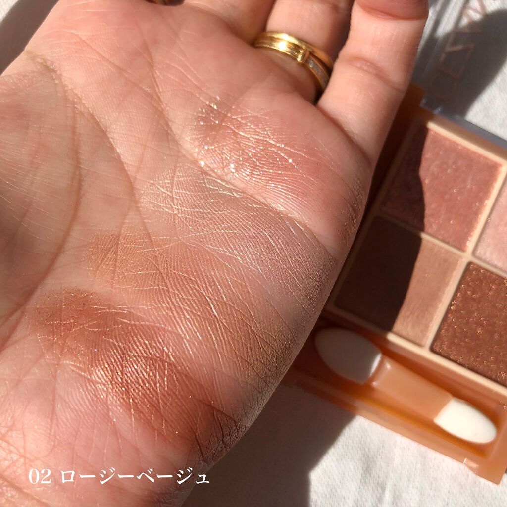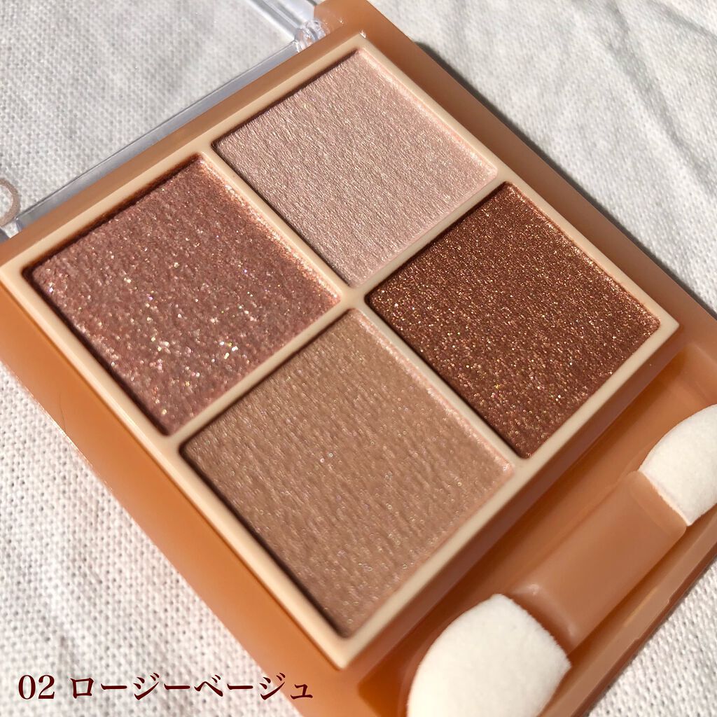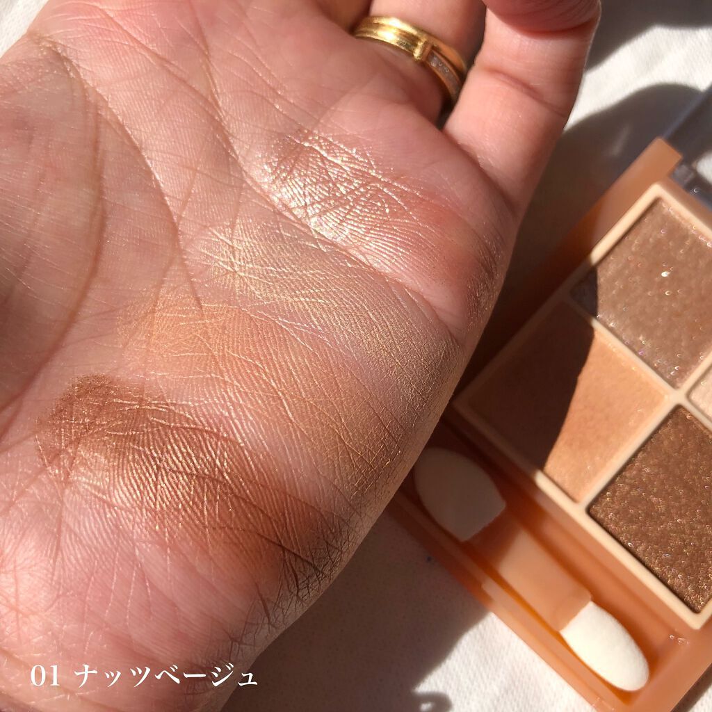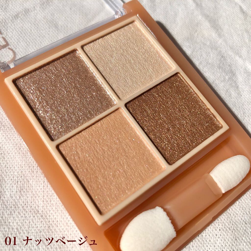 - ラメ・パール・マット3質感の4色アイシャドウ。 肌馴染みの良いベージュを基調としたカラー。ラメ・パール・マットの3質感を重ねて、自然にまぶたを強調し奥行のある大きな目元へ。 しっとり溶け込むような柔らかなパウダーなので、スルスル伸びてまぶたにピタッと密着。保湿成分(スクワラン・ホホバ種子油)配合。