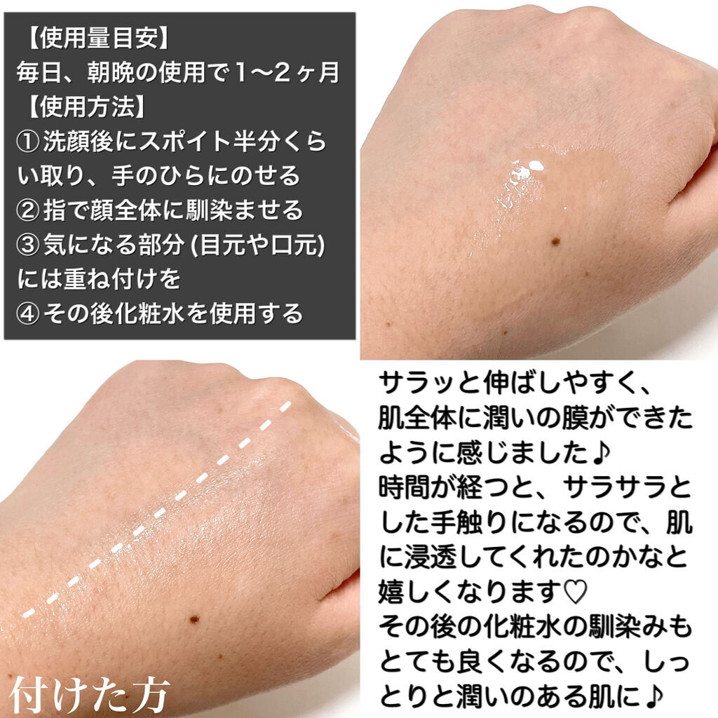 | 出した時はとろっとするのに 肌にのせると ぱしゃっとはじけるように すごくみずみずしく感じるの😇 | 詳細を見る | ||