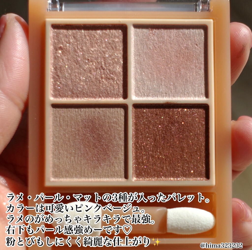 - ラメ・パール・マット3質感の4色アイシャドウ。 肌馴染みの良いベージュを基調としたカラー。ラメ・パール・マットの3質感を重ねて、自然にまぶたを強調し奥行のある大きな目元へ。 しっとり溶け込むような柔らかなパウダーなので、スルスル伸びてまぶたにピタッと密着。保湿成分(スクワラン・ホホバ種子油)配合。