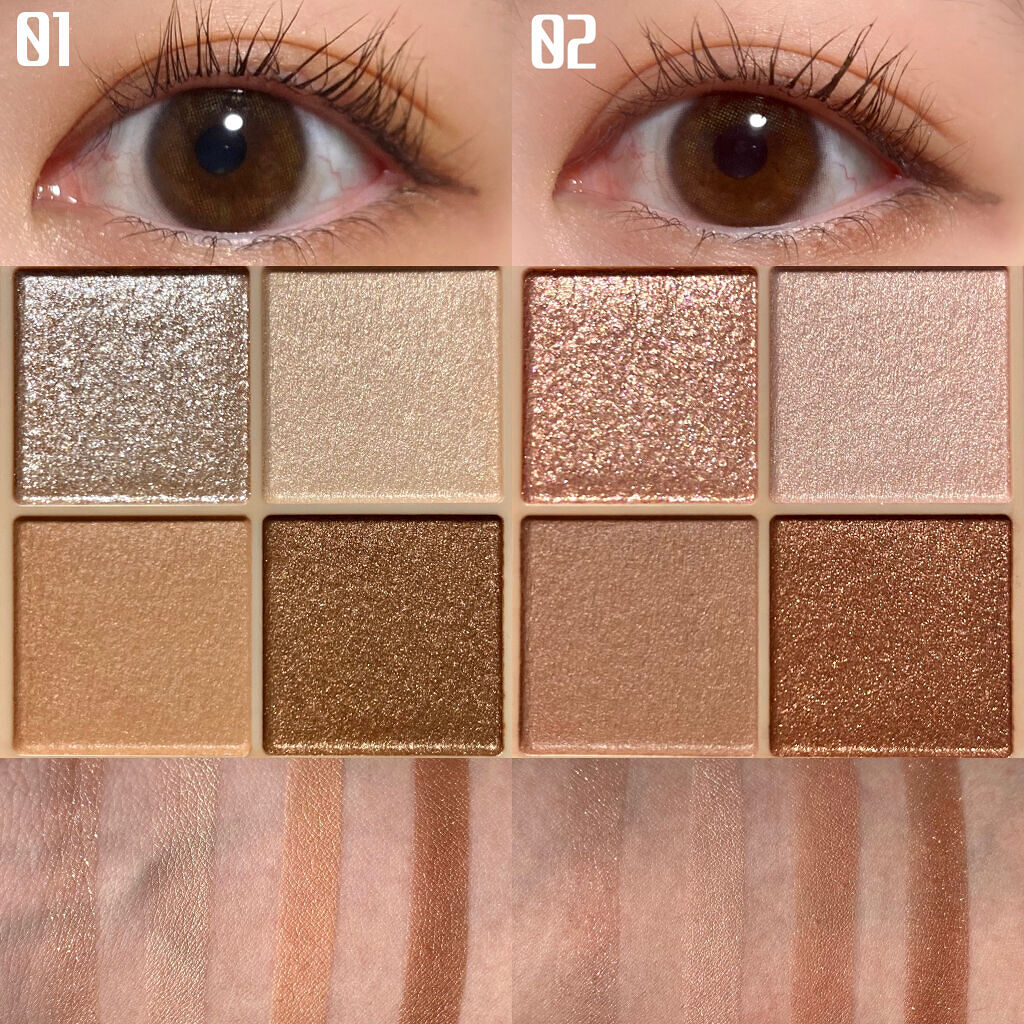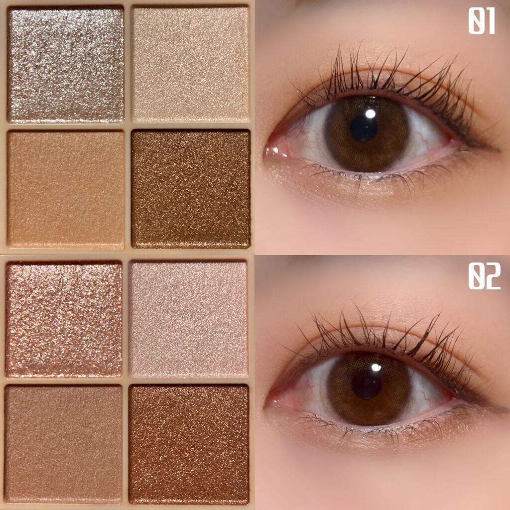 - ラメ・パール・マット3質感の4色アイシャドウ。 肌馴染みの良いベージュを基調としたカラー。ラメ・パール・マットの3質感を重ねて、自然にまぶたを強調し奥行のある大きな目元へ。 しっとり溶け込むような柔らかなパウダーなので、スルスル伸びてまぶたにピタッと密着。保湿成分(スクワラン・ホホバ種子油)配合。