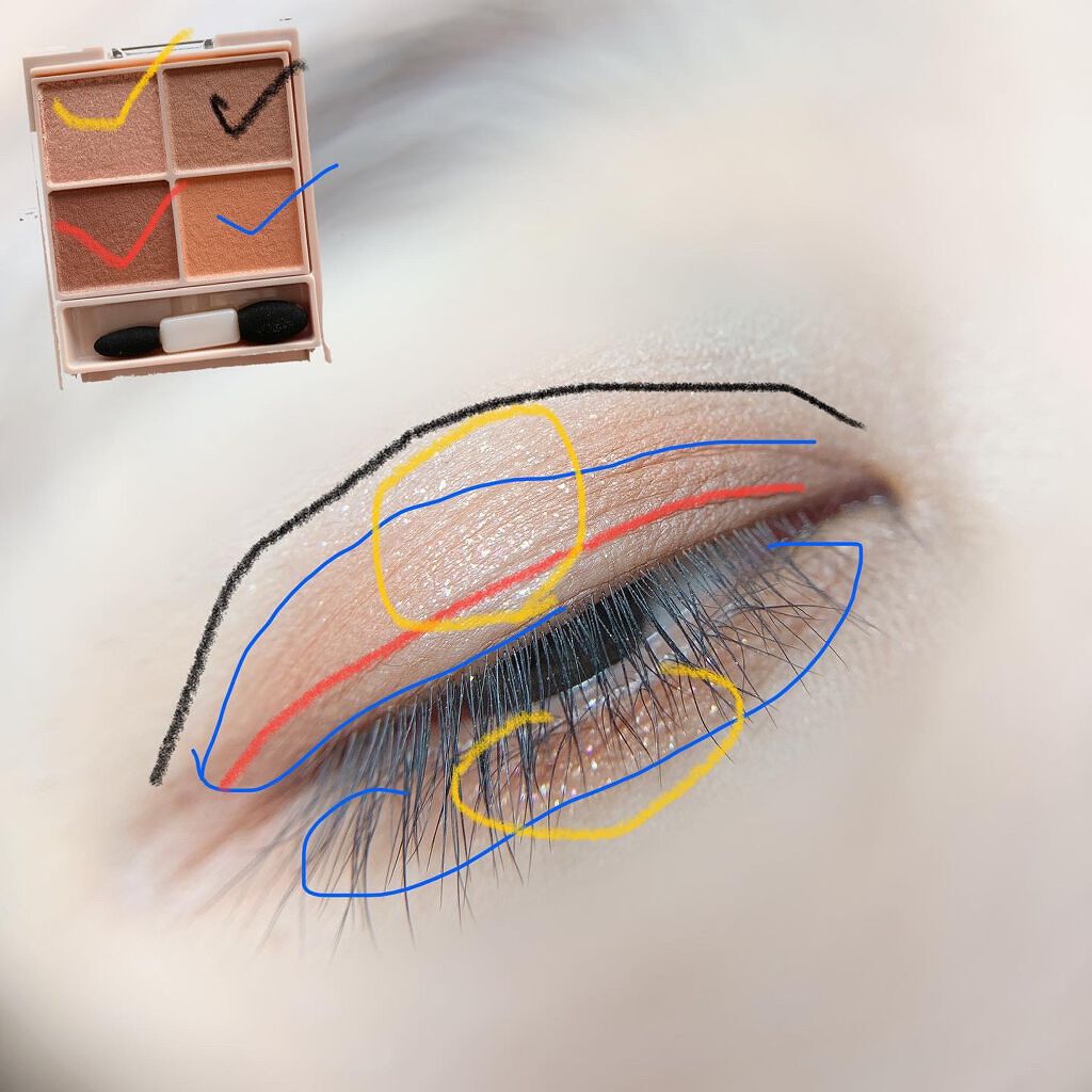 右上の黄色がアクセントカラーに最適で可愛いのと 使いやすく馴染みやすいブラウンカラーなので良く使用しています。 顔のアクセントに跳ね上げラインをしてみました! 跳ね上げラインは強めな服装をしている時に 良くしたくなりますが、ラインが長くなりすぎたり してしまうことがあうので、ショート筆で描きやすいので 今回のメイクも楽しくできました!😊