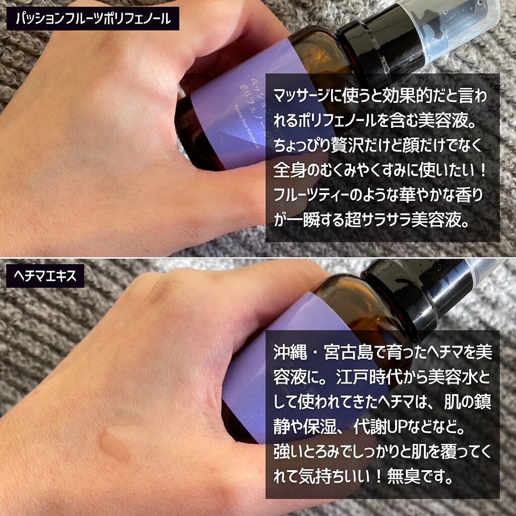 通常化粧品には数パーセントしか配合されていない美容成分を贅沢に100%使用した濃厚美容液💓✨ 原液以外一切不使用の無添加のお肌に優しい美容液だから、デリケートな肌にも使いやすいです☺️💕 中国でビタミンCの多様とも言われているイザヨイバラエキスは、ハリや乾燥悩みを抱えた肌をケアして、バリア機能をサポート✨日差しによるダメージににもオススメの美容液💕 海藻エキス原液は特にとろっとしたテクスチャーで保湿感が足りないなって時に化粧水に混ぜて使うとしっとりもっちりした仕上がりに💕 パッションフルーツはサラッとしたテクスチャーなんだけど、お肌に艶感がでてしっかり水分を閉じ込めてくれる感じがします☺️💕 個人的に、私はあれこれ悩みがあるからパッションフルーツポリフェノールが総合的に私の肌悩みをカバーしてくれそうでお気に入り💓✨