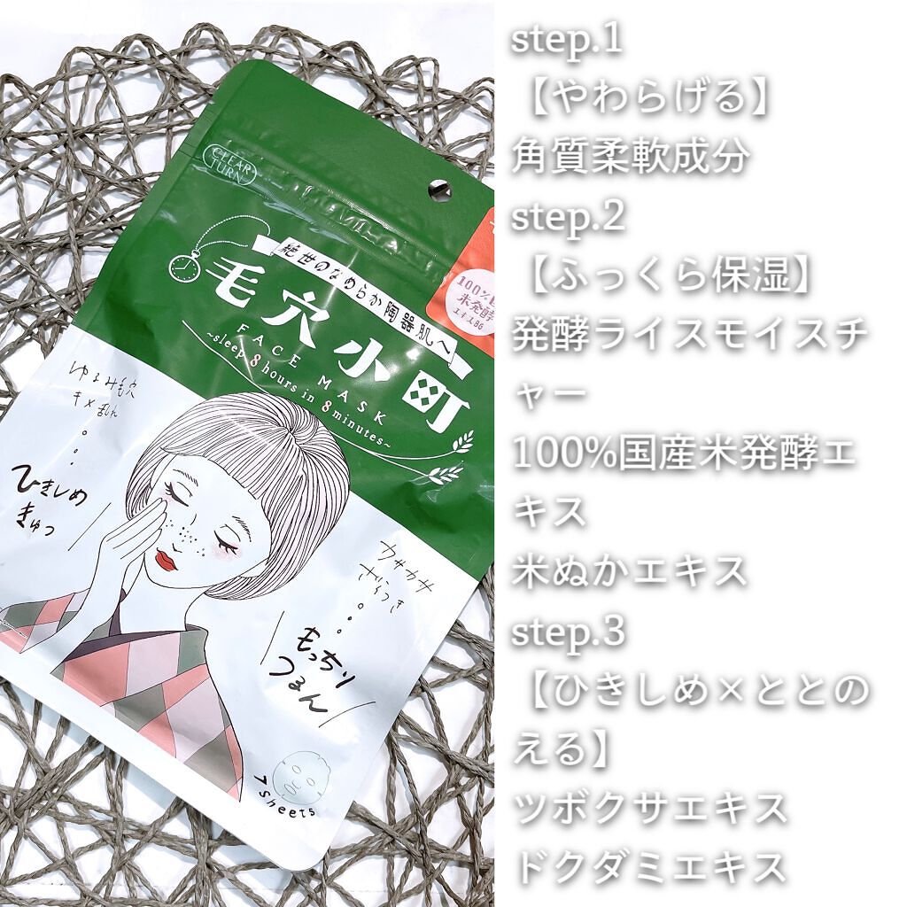 - 毛穴・肌あれが同時にケアできる、毛穴小町マスク! ①毛穴目立ち&肌あれをダブルでケア!なめらか陶器肌へ 水分・油分をバランスよく配合したみずみずしい美容液で、乾燥や皮脂による毛穴目立ちやあれ肌もケアします。キメのととのった、つるんとなめらかな陶器肌に導きます。 角質柔軟成分※3配合。肌をやわらげます。 100%国産米発酵エキス・米ぬかエキス・BG(保湿)をはじめとする発酵ライスモイスチャーCPX配合。ふっくらと保湿します。 ツボクサエキス・ドクダミエキス・BG(保湿)配合。ツボクサエキスは今話題のCICA成分です。肌をひきしめととのえます。 ※3 角質柔軟成分はリンゴ酸 ②角質ケアできる凸凹高密着シート コットン生まれでやわらかな肌触りの国産シートを採用。シートマスクの表面には凸凹のエンボス加工を施しているため、密着性が高く、はがしたマスクでやさしく顔をふきとることで角質ケアもできます。 ③心地よい眠りにみちびくようなリラックスフローラルの香り(天然香料配合) ④やさしい使い心地 弱酸性・無着色・無鉱物油・パラベンフリー・紫外線吸収剤フリー・シリコーンフリーのやさしい使い心地です。
