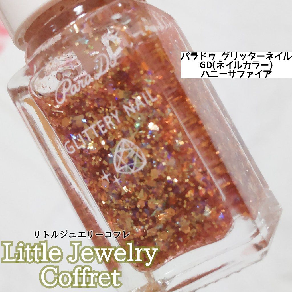 - SNSで人気の商品です! 「リトルジュエリーコフレ」は、パラドゥ史上最高級の輝きで、まばゆいほどのきらめきを演出するネイルカラー。 ワンシーズン使い切りのミニサイズで、ご自宅でセルフネイルを楽しむ方にもお勧めです。 「リトルジュエリーコフレ」のテーマは、「Marie’s Collection」(マリーズコレクション)」。 宝石をこよなく愛し、また宝石にも愛された女性、マリー・アントワネット王妃を魅了した宝石の輝きにインスパイ アされた、色とりどりのきらめきをギュッと詰め込んだ、極上のラメカラーセットです。 キラキラと存在感を放ちながら、美しさが溢れ出るような指先。まばゆく輝く宝石を思わせる3 色は、彩り豊かなラ メをひときわ贅沢に配合した特別仕様です。 光を受けて、うっとりするような輝きがゆらめき、手を動かすたびに、心が躍る。 指先に極上のきらめきが、この夏を華やかに演出します。