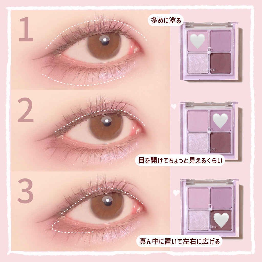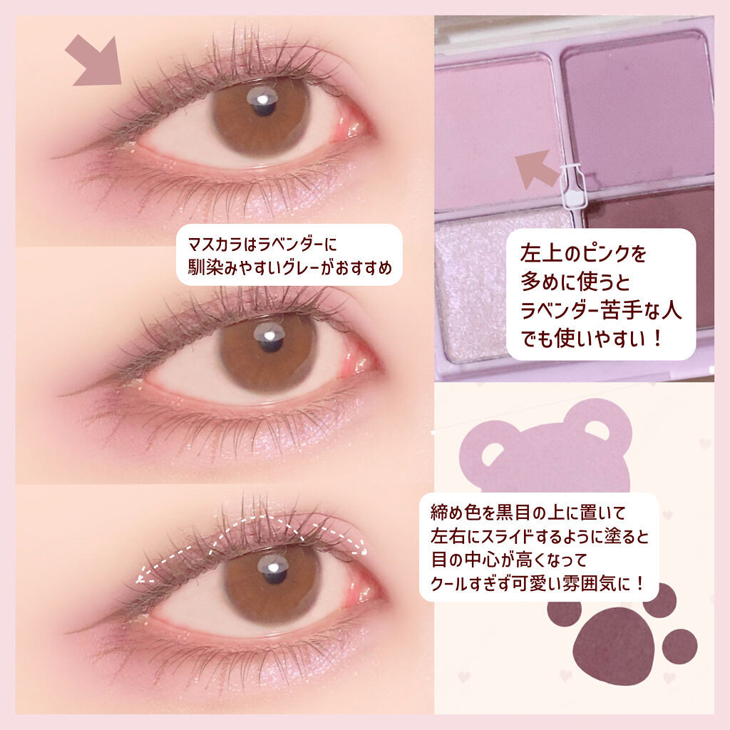 アイシャドウをどう塗ったらいいかわからない人、 何色も重ねると目元がくすんでしまう人におすすめです! 普通のアイメイクに飽きてしまった人や、 離れ目を解消したい人、丸目になりたい人など 目の形に悩みがある人におすすめです! 多色パレットをどう使ったらいいかわからない人、 グラデーションを楽しみたい人におすすめです!