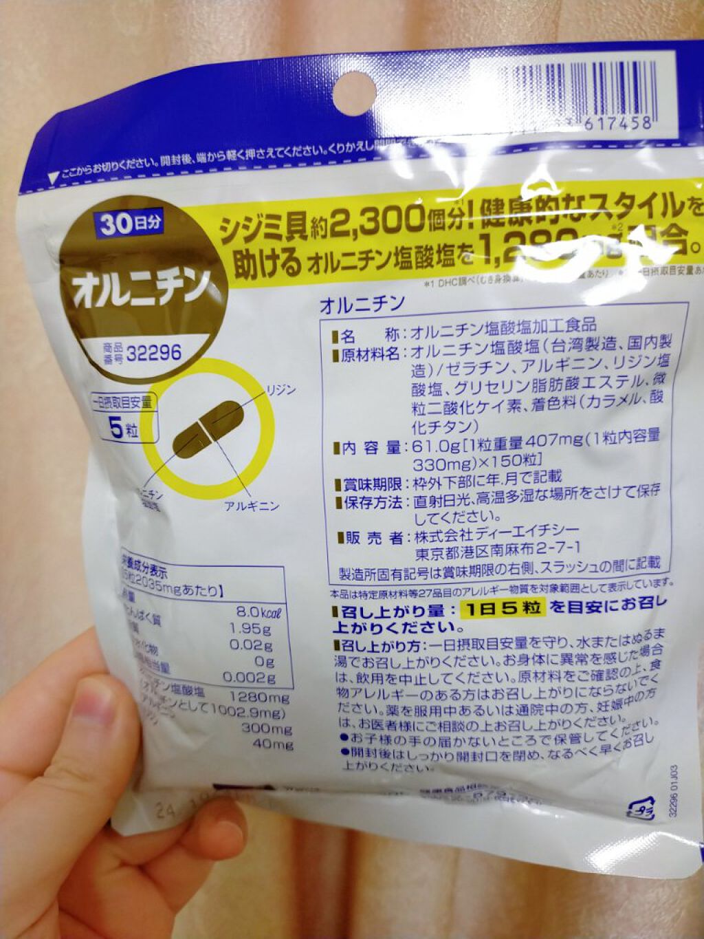 - シジミ貝に多く含まれる健康成分オルニチンを主成分に、成長をサポートするアミノ酸の一種アルギニンとリジンを配合したサプリメント。健康的なボディシェイプを目指す方や酒をよく飲む方に。 【オルニチンとは】 オルニチンはもともと体内に存在するアミノ酸の一種。魚介類、特にシジミ貝に多く含まれる成分で、成長ホルモンのサポートや、年齢とともに低下しがちな代謝にもアプローチするといわれている。 【飲み方】 1日4粒目安 ダイエット中は運動後や、お休み前に摂るのがおすすめです。 【成分】 オルニチン 1日5粒総重量2035mg(内容量1650mg)あたりL-オルニチン塩酸塩1280mg(オルニチンとして1002.9mg)、アルギニン300mg、リジン40mg 【主要原材料】 オルニチン塩酸塩、アルギニン、リジン塩酸塩 【調整剤等】 グリセリン脂肪酸エステル、二酸化ケイ素 【被包剤】 ゼラチン、着色料(カラメル、酸化チタン)