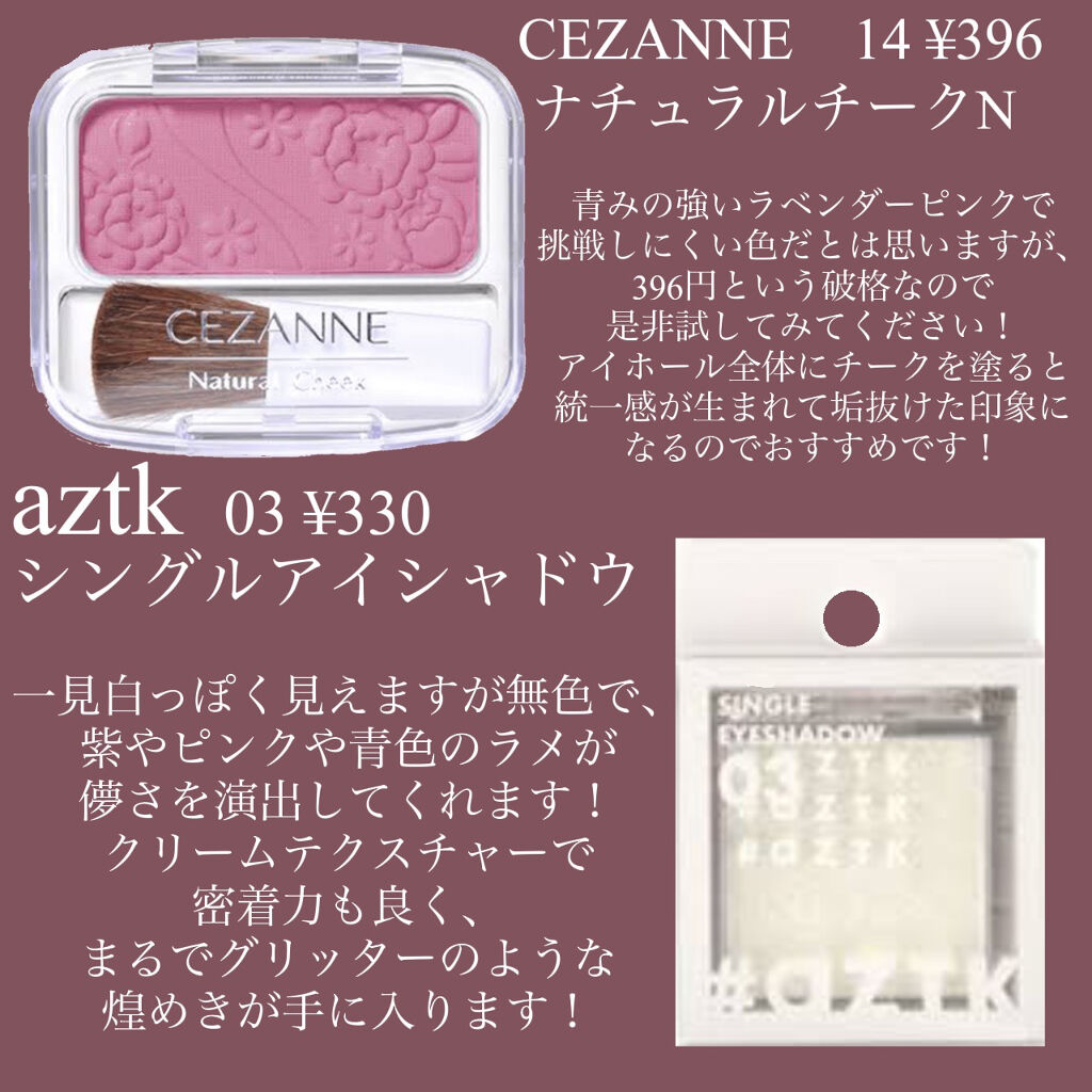 一重を魅せるくすみピンクメイクのご紹介をしたいと思います!蒙古襞や離れ目が気になる方や、ピンク系のアイシャドウを使うと腫れぼったく見えてしまう方などそれぞれ色んな悩みがあると思いますが、今回はそんな方に是非見ていただきたい内容になっていますので参考にしていただけたら光栄です︎ ❤︎ アイシャドウとチークを同じにすることで統一感がでるのでオススメです!この可愛いくすみピンクが大体ワンコインで買えちゃうのが信じられなくて、私はリピートしています…т ᴗ т くすみピンクカラーもラメも可愛いので100円以上のクオリティです!マットで控えめな発色だから、目尻にブラウンをのせてもしっかり馴染んでくれるのが使いやすくてオススメです>ᴗ<