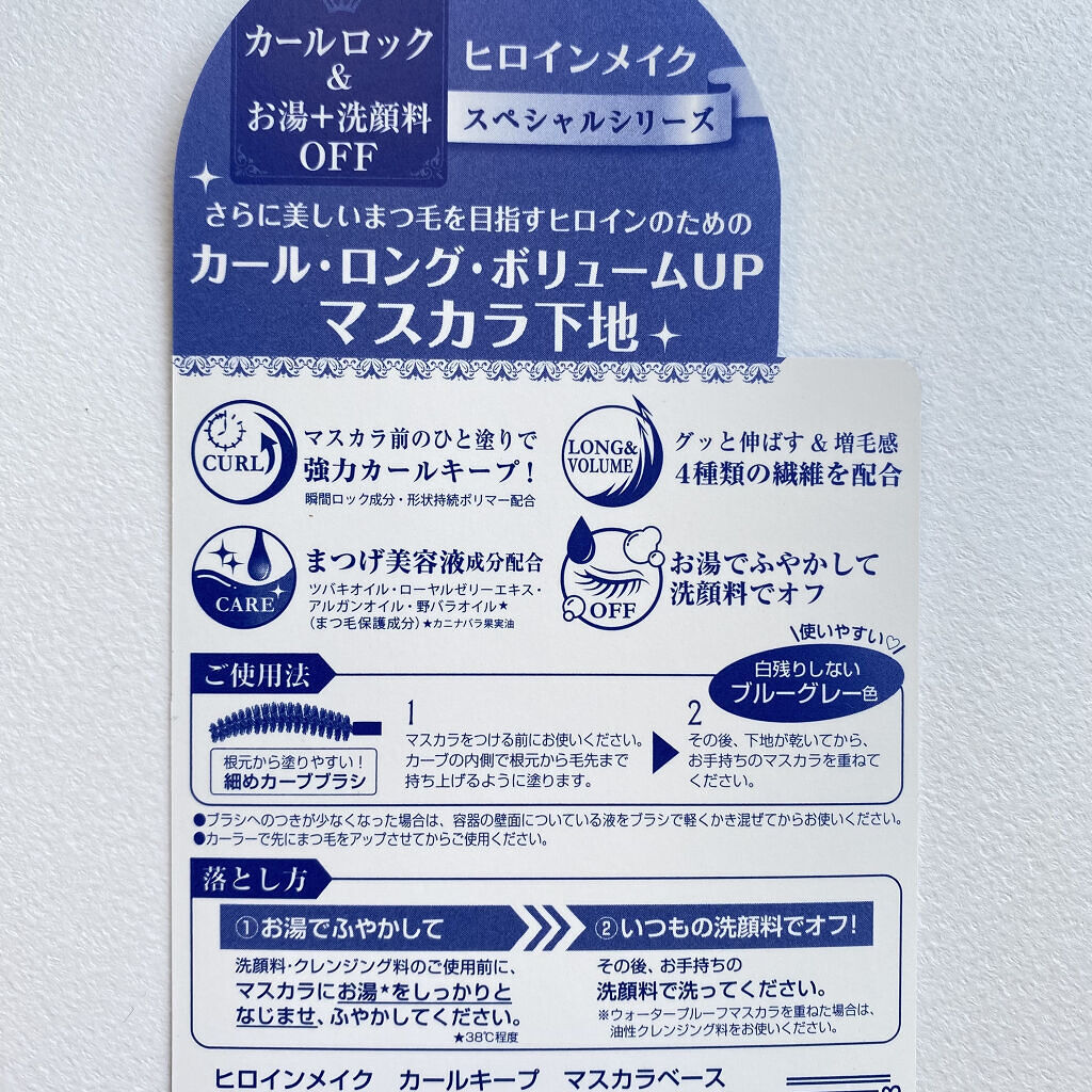 いろんなベース使ってきたけど私はこれが一番好き。 ロング、ボリューム、カール、全てを叶えるマスカラベース! ブラシも小ぶりで塗りやすいし、 カールキープされるのにまつ毛がパリパリにならない。 ブルーグレーだけどまつ毛に塗ったら違和感なし。これ一本でも使えるし、上から重ねるマスカラの邪魔もしない♪ さらに美容液成分配合で、お湯と洗顔料で落ちる。 本当に1日カールキープされるからオススメ!