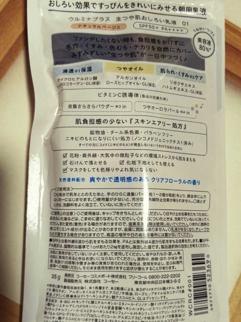 オイルブロックパウダー&うるさらキープパウダー配合で、皮脂・テカリをブロックしながら毛穴をカバーしてメイクしたてのうるさら肌を1日中キープする、みずみずしいスキンケアタッチのおしろい乳液。 トーンアップ&色ムラ補正効果のあるイエローカラー。爽やかなクリアフローラルの香り。 ツヤ感は程々に出て良いのですが、塗った方が汚くなる物は使えないのでボディ行きです🥲