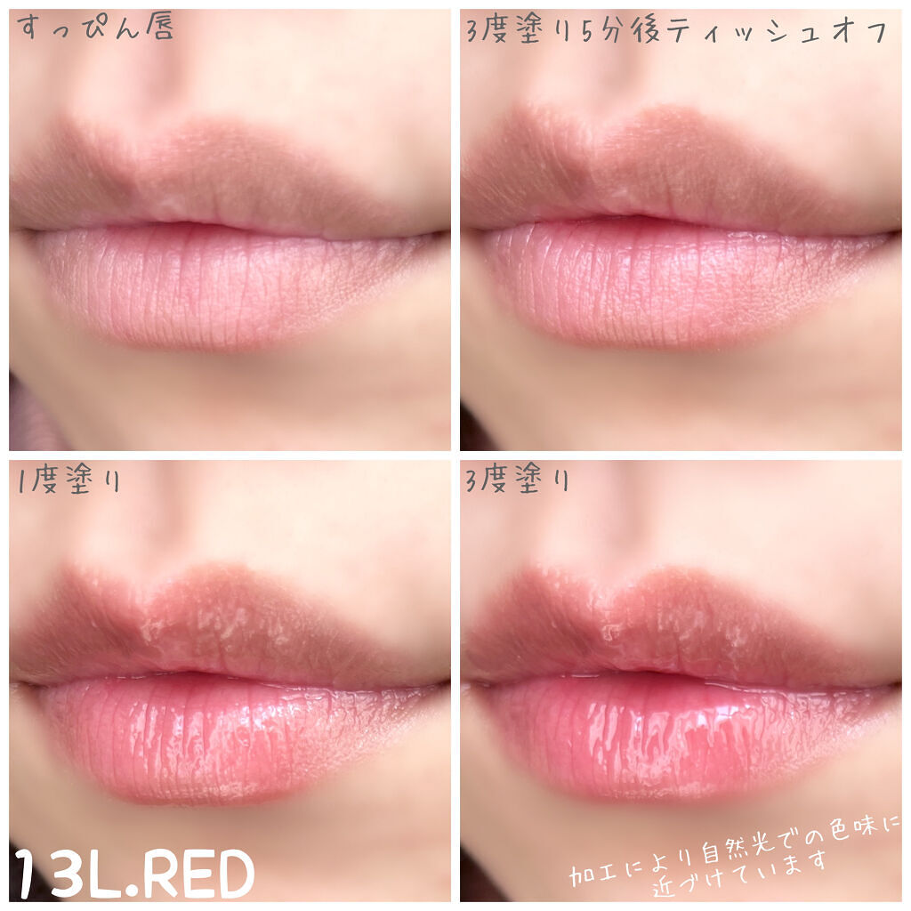- 単体でもキレイな色づき。リップとの重ね塗りもおすすめ。透明感のあるカラーだから、自分の唇の色にもマッチ。 強すぎない発色で、他のカラーとの重ね塗りも自然な仕上がり。オイル配合によって、艶のあるふっくらとした唇に。