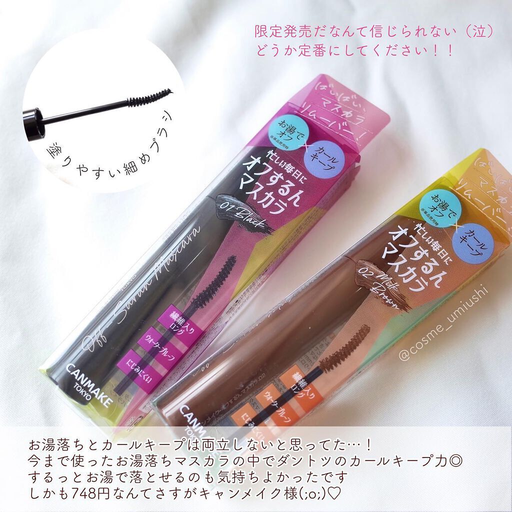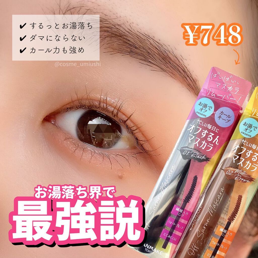 - カールキープマスカラってオフが面倒…手間がかかる…💦 そんなお悩みに寄り添った、お湯でするんっと落とせる“お湯オフカールキープマスカラ”が新登場! ウォータープルーフ・スマッジプルーフなのに指でまつげを優しく挟み、 指を動かしながらお湯になじませると、簡単にするんっとオフできる! 日々忙しい私たちの味方です♥ 長さ2㎜の繊維がなめらかなマスカラ液と絡んで、まつげにきれいにのり、なめらかなロングまつげに! 塗りやすく、まぶたにフィットするカーブブラシもうれしい!