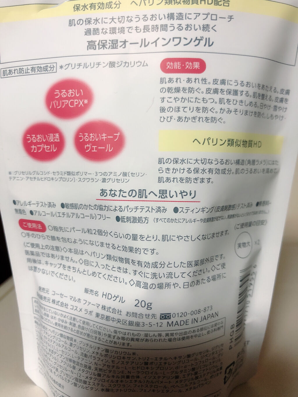 - <20g> 有効成分 グリチルリチン酸ジカリウム、ヘパリン類似物質 その他の成分 ベヘニルアルコール、ジグリセリン、フェノキシエタノール、メチルパラベン、スクワラン、ワセリン、濃グリセリン、イソステアリン酸、カルボキシビニルポリマー、精製水、メチルポリシロキサン、トリ2-エチルヘキサン酸グリセリル、エデト酸二ナトリウム、セトステアリルアルコール、1,3-ブチレングリコール、ポリオキシエチレン硬化ヒマシ油、グリセリルグルコシド液、アクリル酸・メタクリル酸アルキル共重合体、グリコシルトレハロース・水添デンプン分解物混合溶液、天然ビタミンE、グリセリン脂肪酸エステル、流動パラフィン、水酸化ナトリウム、フィトステロール、L-テアニン、グリセリル-N-(2-メタクリロイルオキシエチル)カルバメート・メタクリル酸ステアリル共重合体、L-セリン、dl-α-トコフェロール、モノステアリン酸ポリエチレングリコール、N-アセチル-L-ヒドロキシプロリン、ジペンタエリトリット脂肪酸エステル(1)、モノパルミチン酸ソルビタン、N-ラウロイル-L-グルタミン酸ジ(コレステリル・ベヘニル・オクチルドデシル)