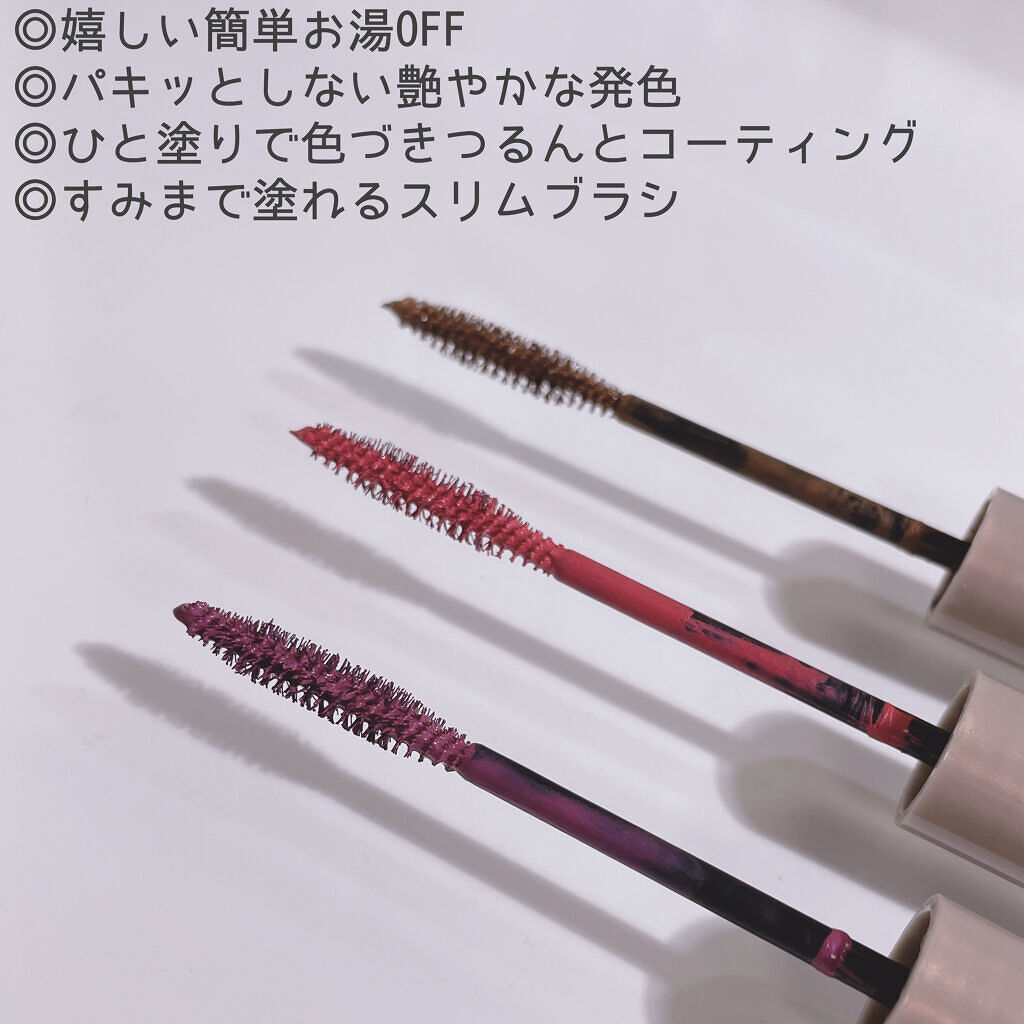- 鮮やかなのに浮かず、お湯で簡単オフ。 軽やかにまつげをいろどる「フィルムタイプ」のカラーマスカラ。 さっと塗れば、ムラを防いでキレイ色が色づき、まつげ一本一本を際立たせます。 ●長時間にじみにくい お湯で簡単オフ ●パキッとしない つややかな発色 ●ひと塗りで色づき ダマや束になりにくいセパレート