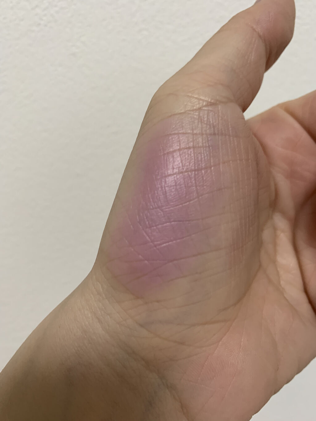 青みが強いラベンダーのチークです。青みが得意なブルベの方におすすめです。 粉質は硬めですが発色がよく頬にふんわり色づきます。 見た目が濃い紫ですが頬にのせると意外にも薄づきで使いやすいです。