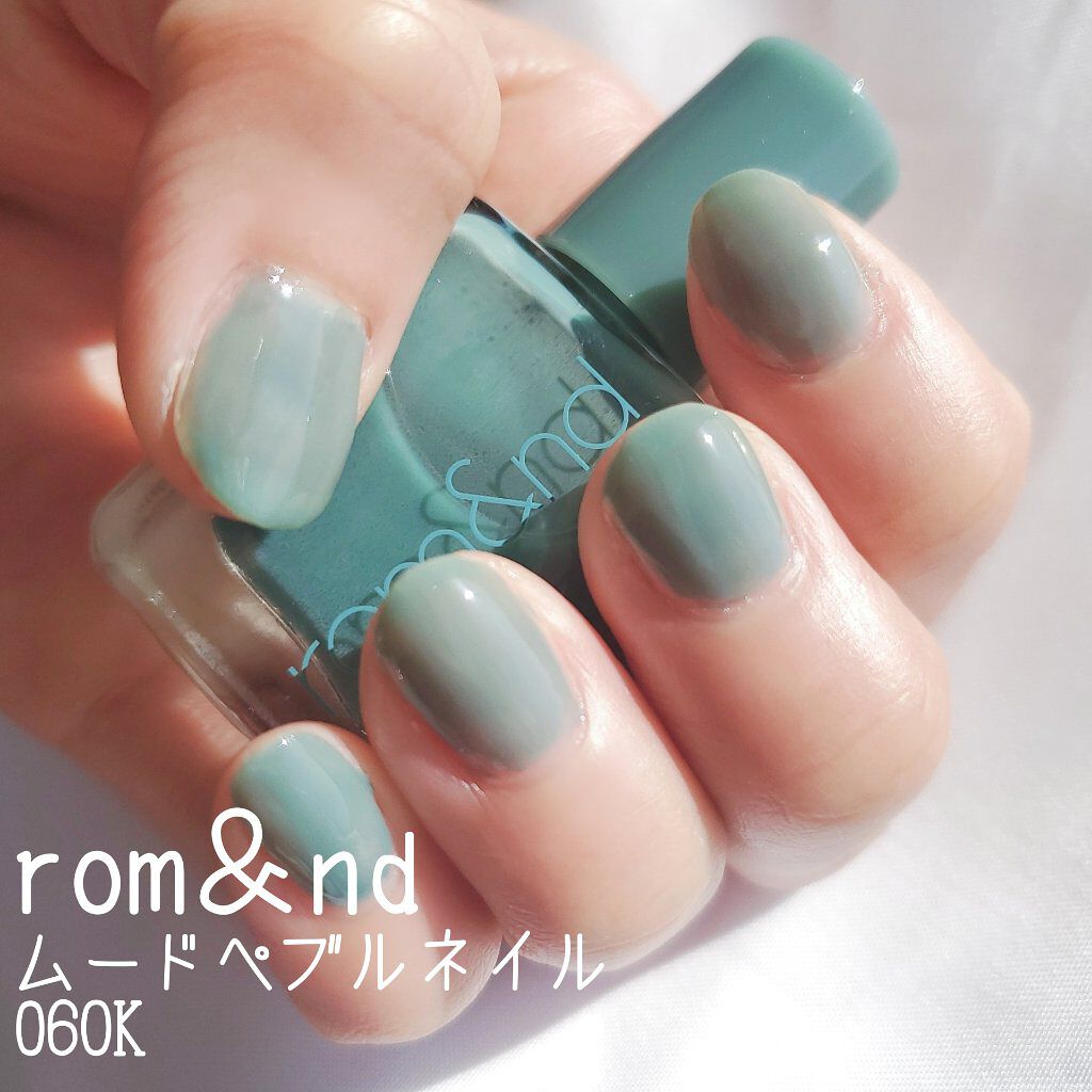 - 指先に玉石のような、ならかな光沢をとどめる。塗った瞬間から綺麗なツヤと光沢を維持し、重ねて塗っても透き通ったカラー感を鮮やかにとどめる、素早い乾燥力のナチュラルカラーネイル。「ロムアンド」の次世代型ネイルです。