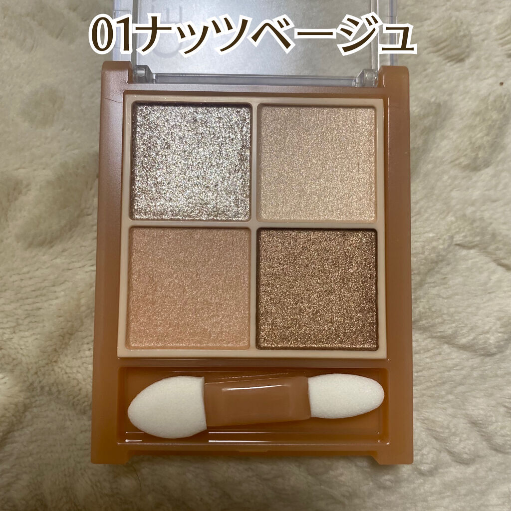 - ラメ・パール・マット3質感の4色アイシャドウ。 肌馴染みの良いベージュを基調としたカラー。ラメ・パール・マットの3質感を重ねて、自然にまぶたを強調し奥行のある大きな目元へ。 しっとり溶け込むような柔らかなパウダーなので、スルスル伸びてまぶたにピタッと密着。保湿成分(スクワラン・ホホバ種子油)配合。