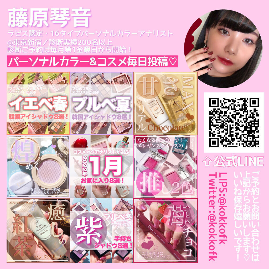 薄く唇に密着する新作マットティント。 マットなのにかなりしっとりとしていて 乾燥を感じなくてびっくりでした! 一気にこなれ感が出るトレンドカラーです♡ やや青みの華やかローズレッド 公式画像より鮮やかめに感じました。 やや黄みの強くて深いオレンジレッド ストロングオータムに超激推しです! やや黄みの非常に深く濃いダークブラウン ディープオータムに激推しです! かわいい雰囲気になれるピンクリップです♡ やや青みの柔らかいくすみピンクベージュ ミューテッドサマーにおすすめです! 青みの落ち着いたローズピンク やや青みのとても鮮やかなビビッドレッド ビビッドウィンターに特におすすめ! 既存マットティントよりもさらに ふわふわなマット感が魅力のリップで、 軽くティッシュオフしてもほとんど落ちない◎ マスクにも激推しのティントなので、 ぜひ皆さんもチェックしてみてね❤︎