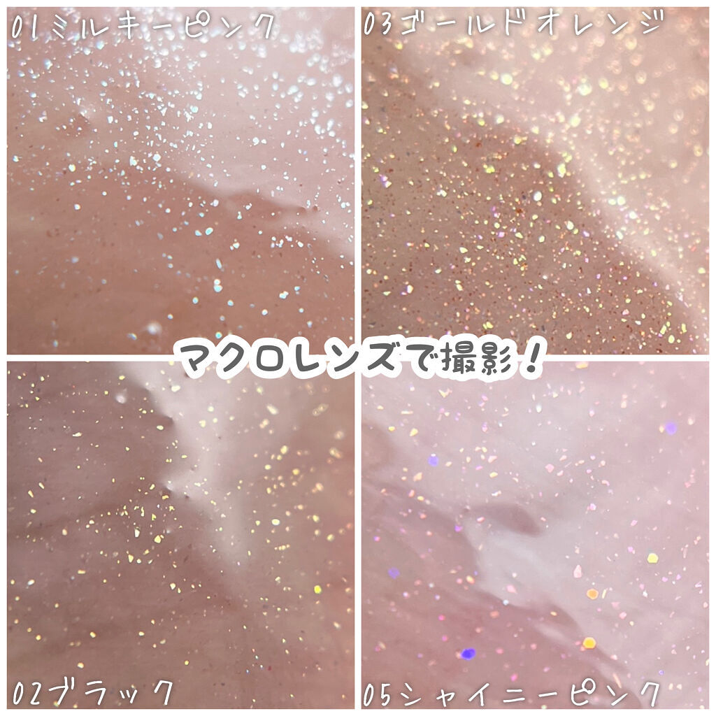 キラキラ輝く可愛さが手軽に楽しめる! アイシャドウ、涙袋、まつ毛に、唇にとマルチに楽しめるグリッタージェル。 乾燥崩れやヨレも屋内半日程度なら特に問題無しでした。いつぞやのダイソーコスメの某グリッターのように「塗った瞬間からしみる、痛い」なんてことも無かったので一安心。 青みピンクラメのミルキーピンクが可愛さカンストしててオススメです。