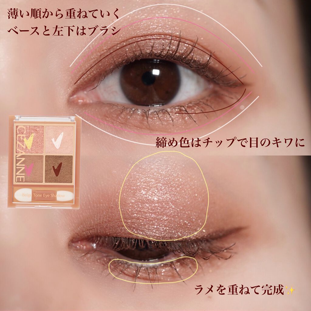 - ラメ・パール・マット3質感の4色アイシャドウ。 肌馴染みの良いベージュを基調としたカラー。ラメ・パール・マットの3質感を重ねて、自然にまぶたを強調し奥行のある大きな目元へ。 しっとり溶け込むような柔らかなパウダーなので、スルスル伸びてまぶたにピタッと密着。保湿成分(スクワラン・ホホバ種子油)配合。