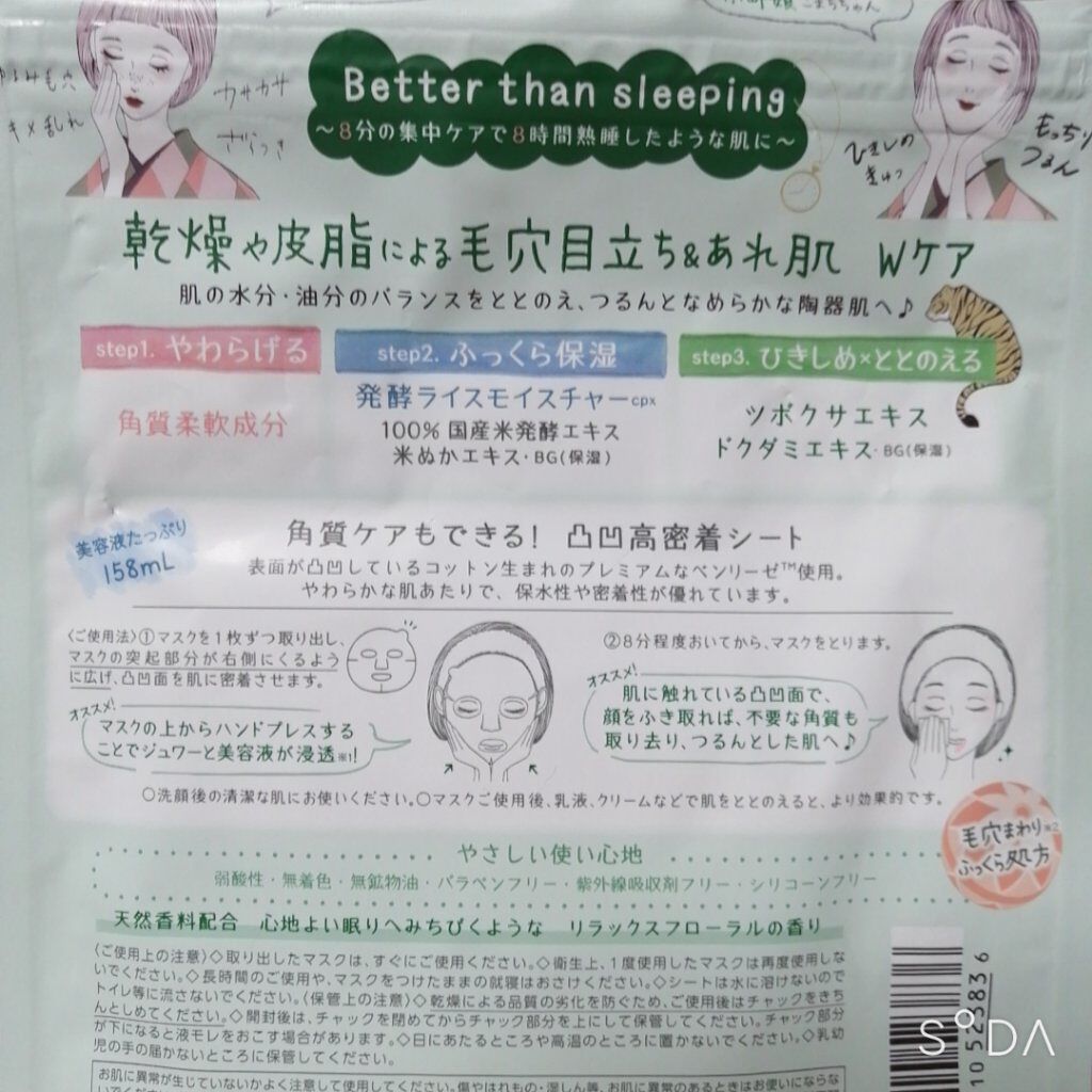 - 毛穴・肌あれが同時にケアできる、毛穴小町マスク! ①毛穴目立ち&肌あれをダブルでケア!なめらか陶器肌へ 水分・油分をバランスよく配合したみずみずしい美容液で、乾燥や皮脂による毛穴目立ちやあれ肌もケアします。キメのととのった、つるんとなめらかな陶器肌に導きます。 角質柔軟成分※3配合。肌をやわらげます。 100%国産米発酵エキス・米ぬかエキス・BG(保湿)をはじめとする発酵ライスモイスチャーCPX配合。ふっくらと保湿します。 ツボクサエキス・ドクダミエキス・BG(保湿)配合。ツボクサエキスは今話題のCICA成分です。肌をひきしめととのえます。 ※3 角質柔軟成分はリンゴ酸 ②角質ケアできる凸凹高密着シート コットン生まれでやわらかな肌触りの国産シートを採用。シートマスクの表面には凸凹のエンボス加工を施しているため、密着性が高く、はがしたマスクでやさしく顔をふきとることで角質ケアもできます。 ③心地よい眠りにみちびくようなリラックスフローラルの香り(天然香料配合) ④やさしい使い心地 弱酸性・無着色・無鉱物油・パラベンフリー・紫外線吸収剤フリー・シリコーンフリーのやさしい使い心地です。